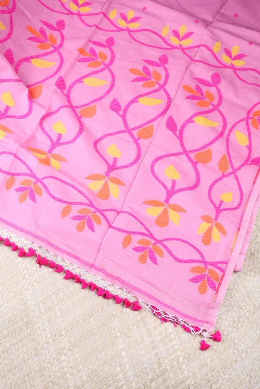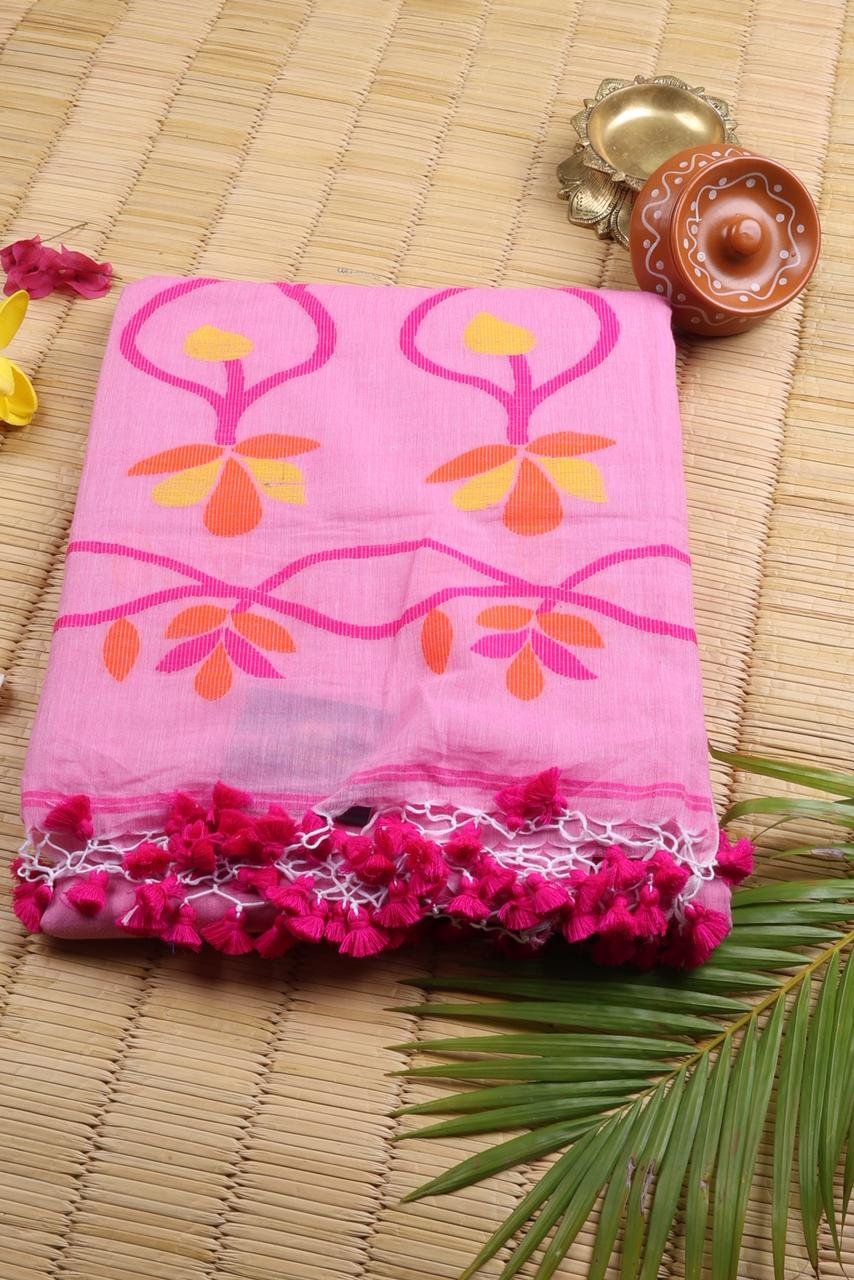 Baby Pink Mulmul Cotton Saree with Jamdani Floral Weaving | Soft Lightweight Saree