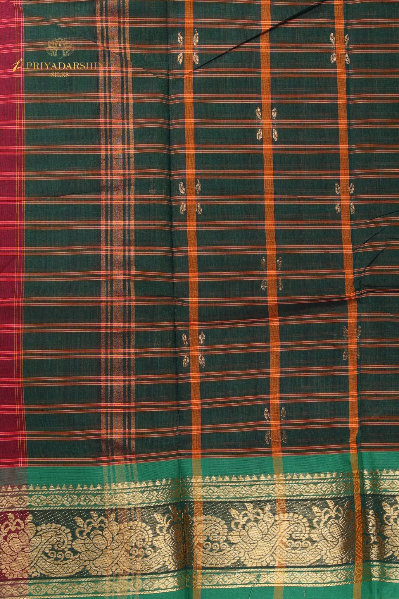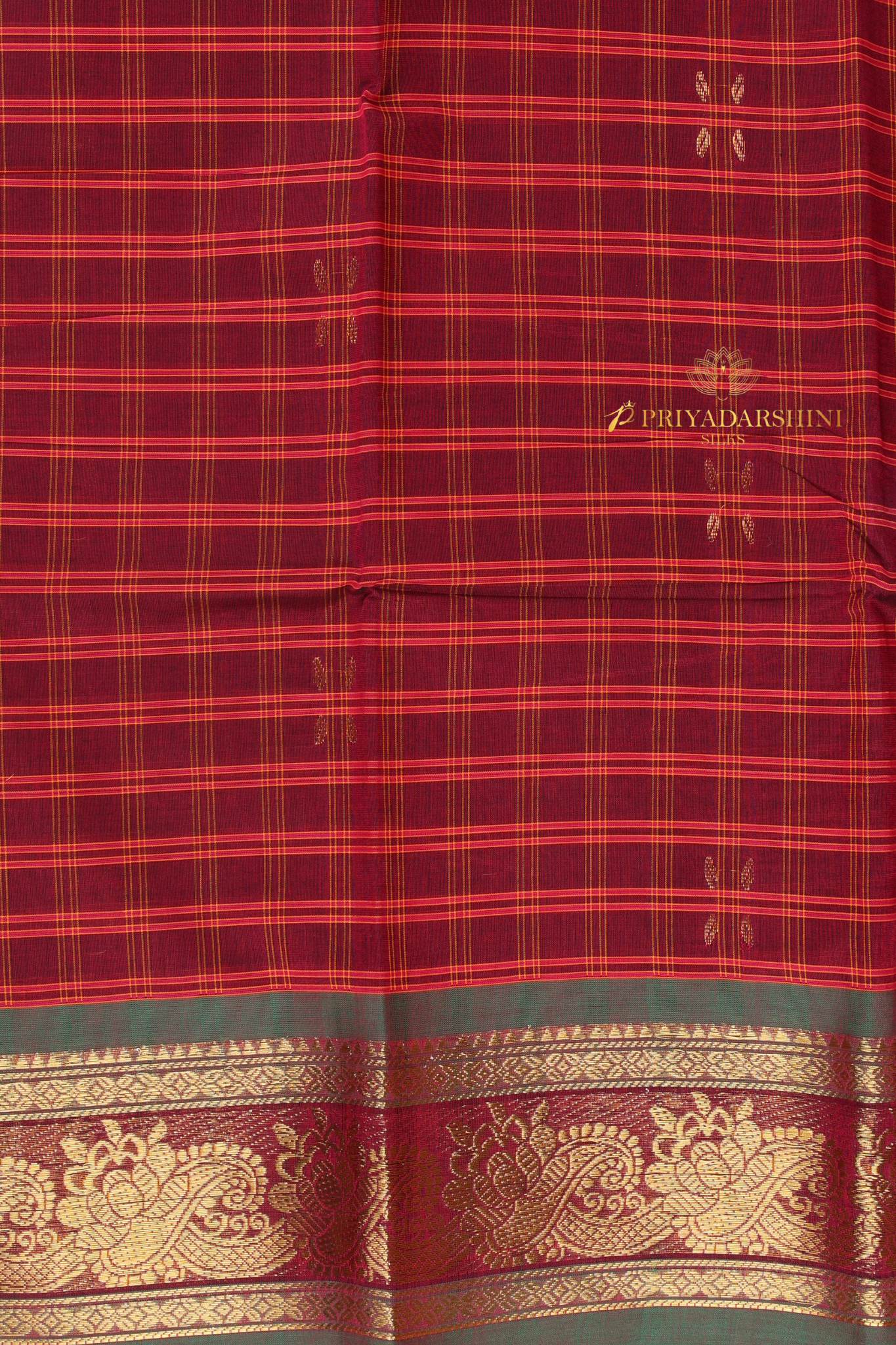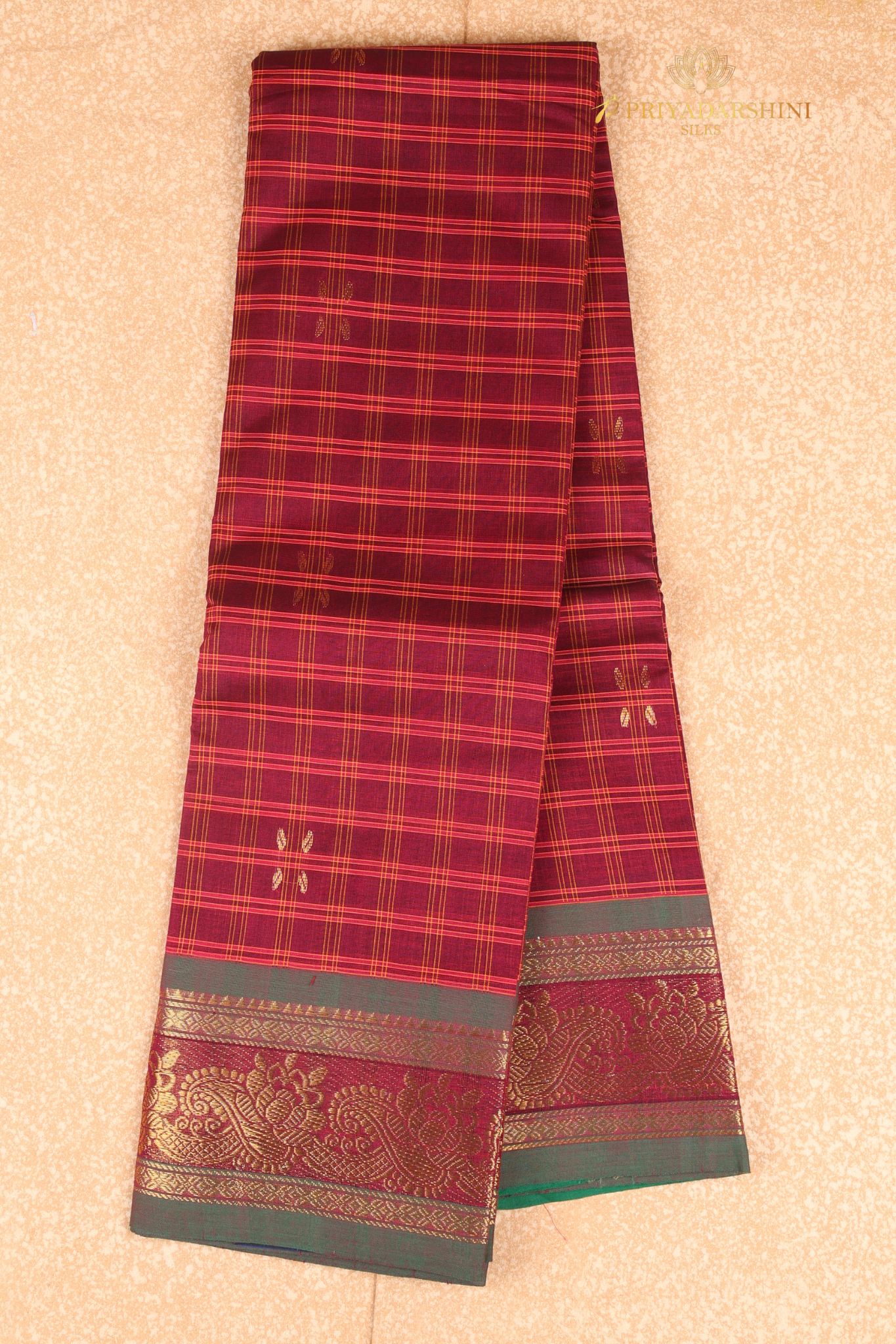 Deep Maroon & Bottle Green Chettinad Cotton Saree | Gold Zari Checks Floral Border