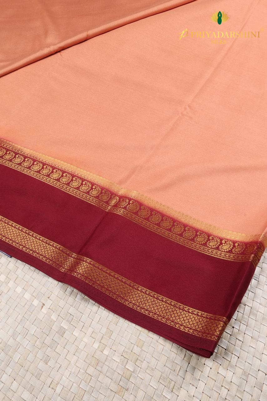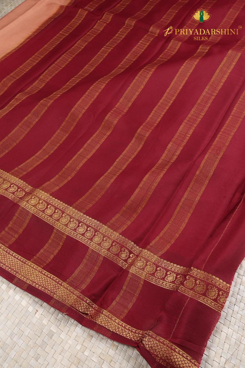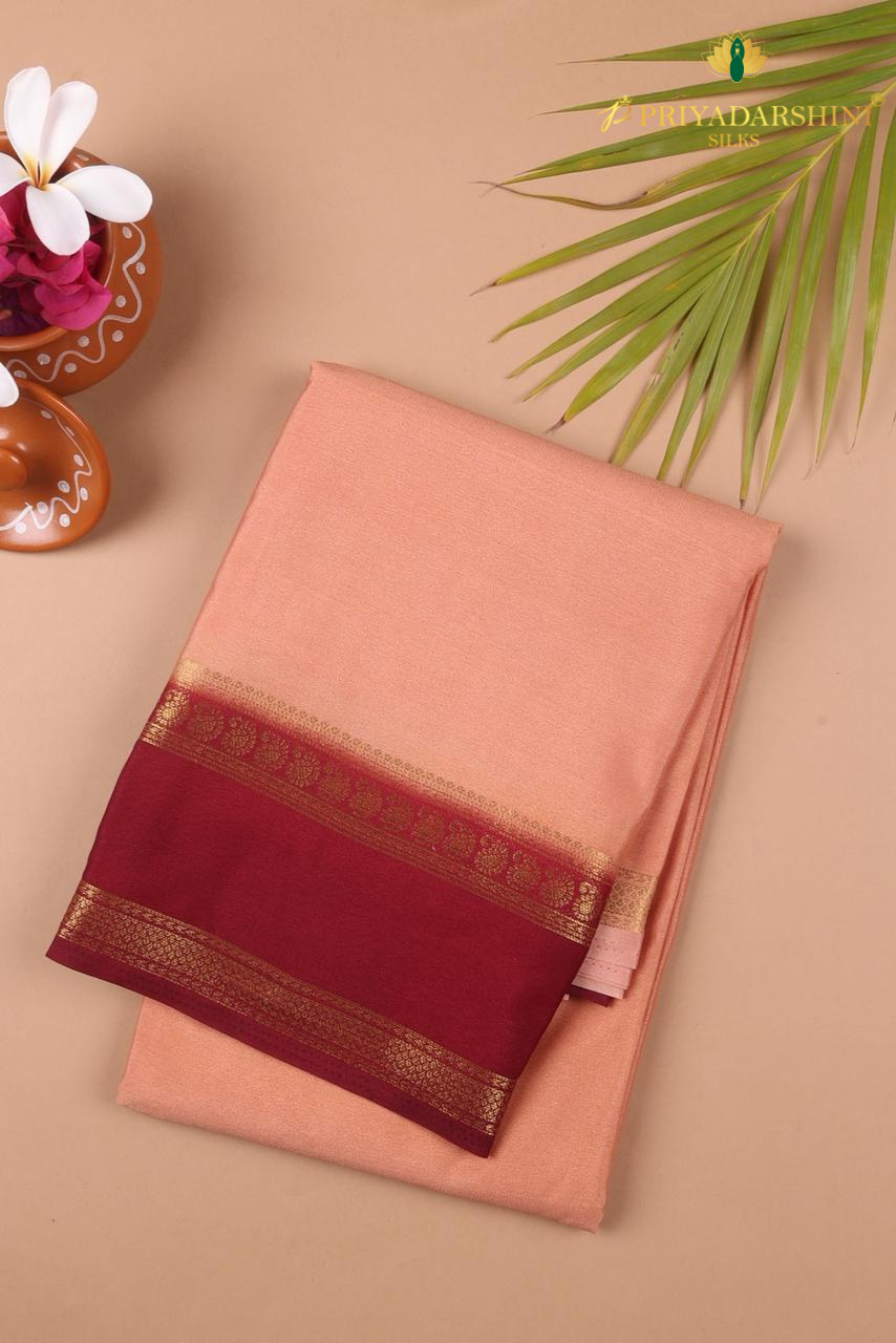 Elevate your traditional wardrobe with this Dusty Peach and Maroon Mysore Silk Saree featuring fine gold zari work from Priyadharshini Silks. Woven from premium quality Mysore silk, this saree combines a soft dusty peach body with a rich maroon border, creating a stunning and sophisticated contrast.