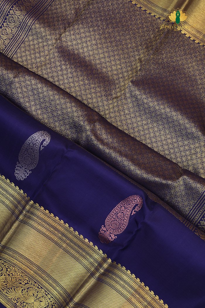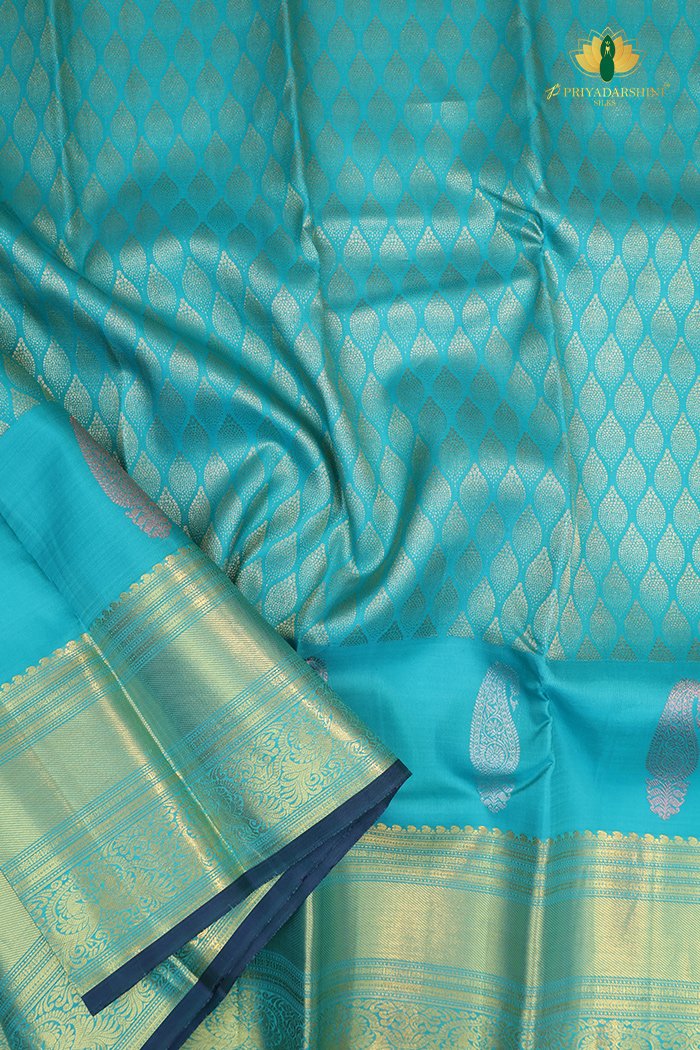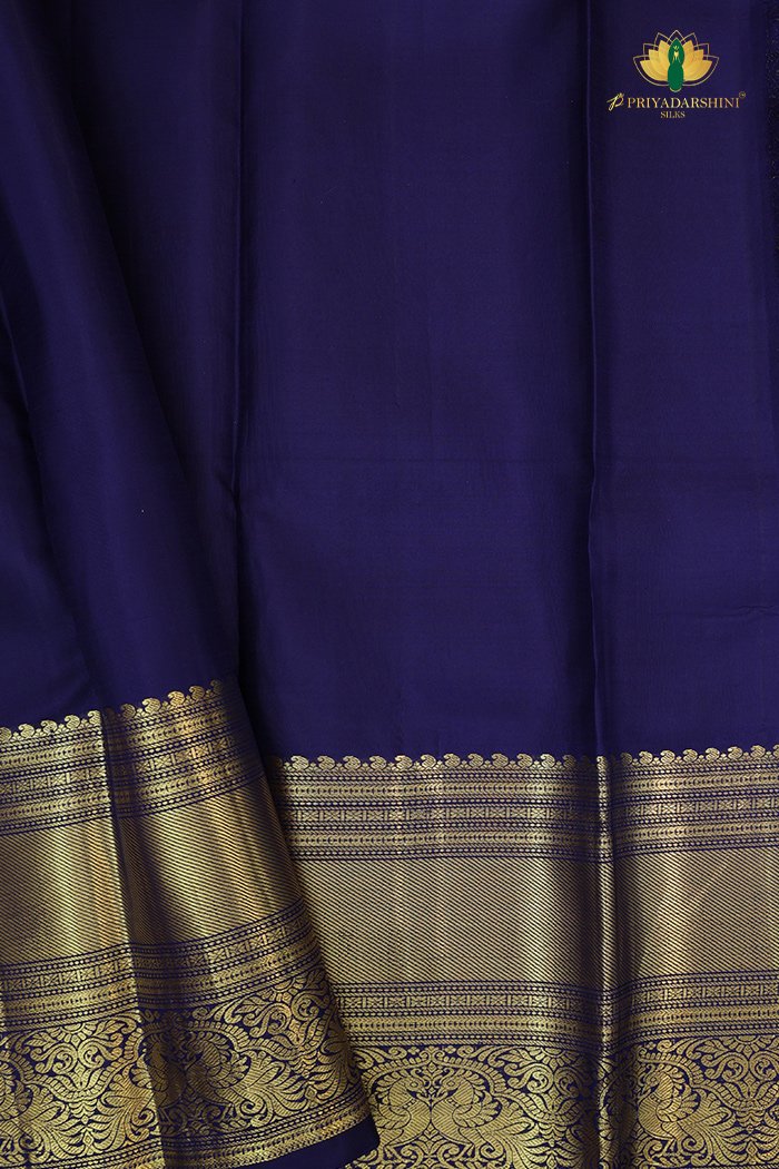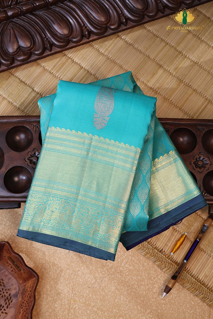 This timeless Kanchipuram pure silk saree in a captivating Rama blue hue features intricately woven traditional motifs that celebrate the heritage of Kanchipuram craftsmanship. Handwoven with precision, the designs add depth and cultural richness, making this saree an ideal choice for weddings, muhurtham, and festive occasions. A perfect blend of tradition, elegance, and grandeur.
