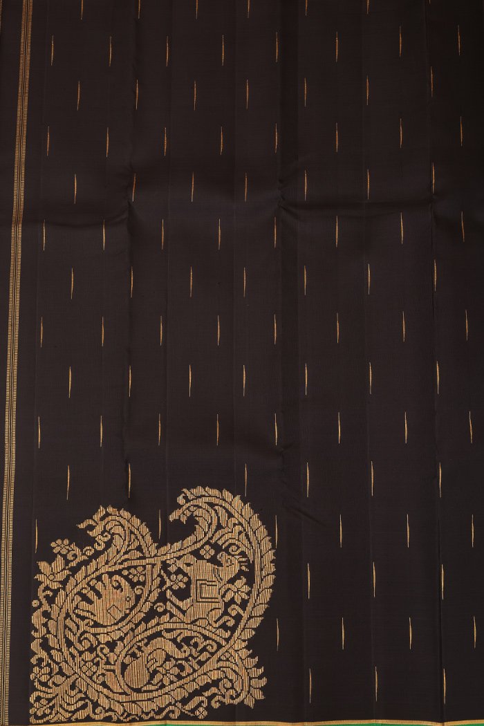 This elegant Kanchipuram pure silk saree in a deep and classic black hue is beautifully enhanced with traditional Malli Moggu (jasmine bud) motifs, symbolizing purity, grace, and auspicious beginnings. Crafted in a refined borderless design, the saree highlights the intricate motifs while offering a clean and contemporary aesthetic rooted in tradition.
