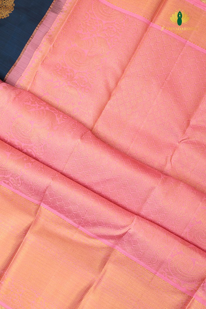 Kanchipuram Silk In Dark Blue With Pink Korvai Border