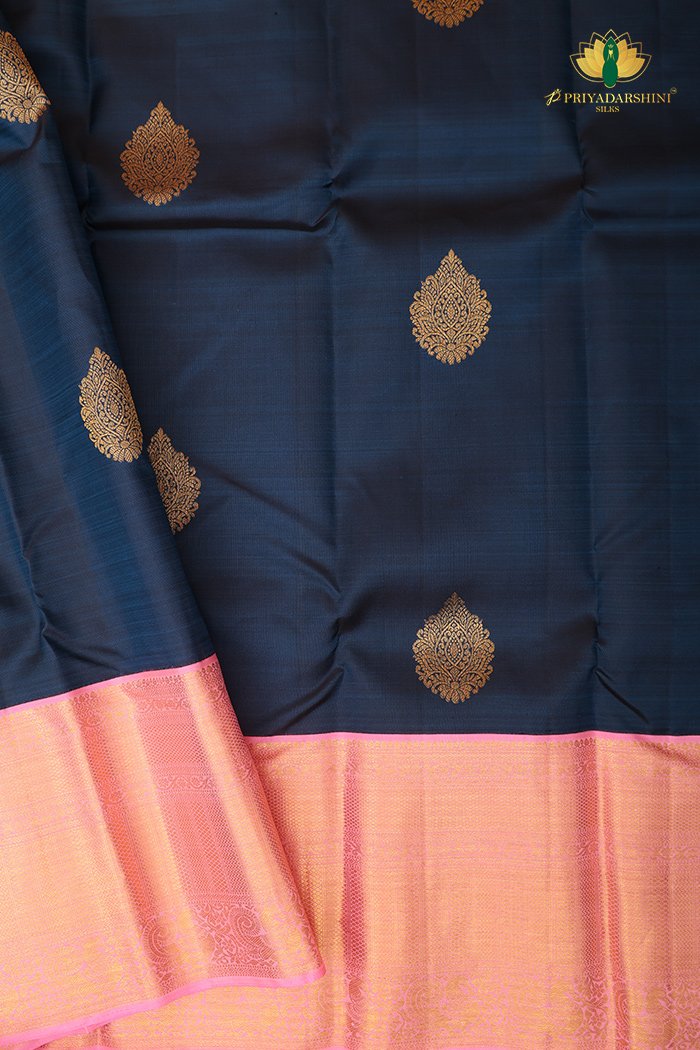 Striking Kanchipuram silk saree in deep dark blue, accented with a vibrant pink Korvai border for a bold traditional look.