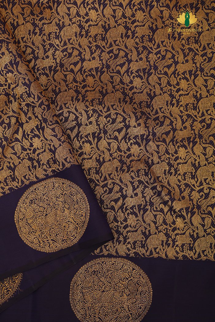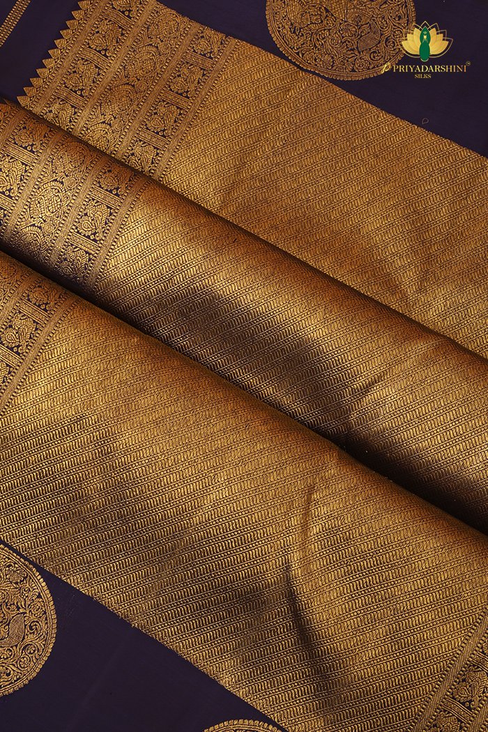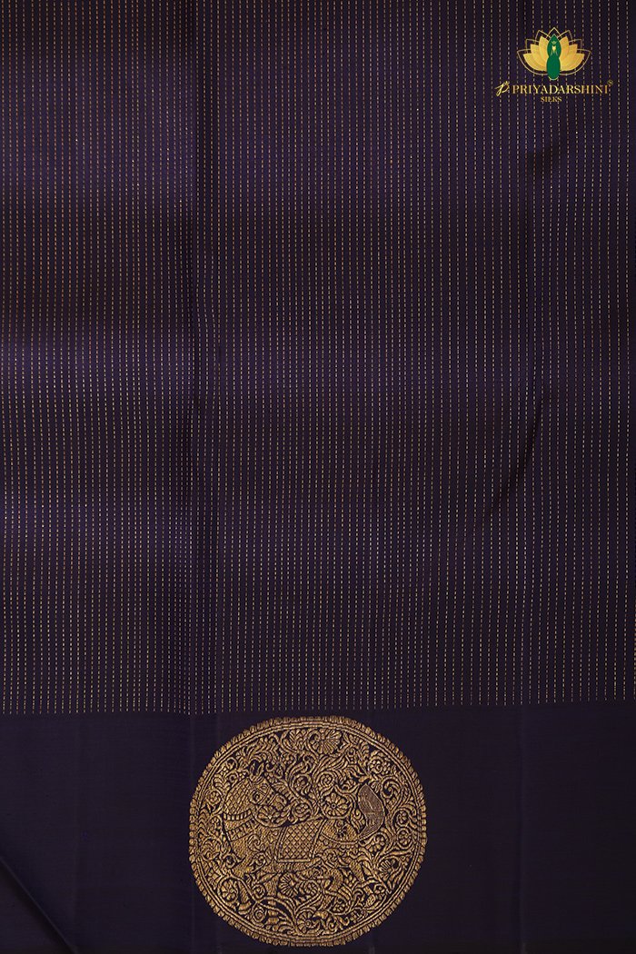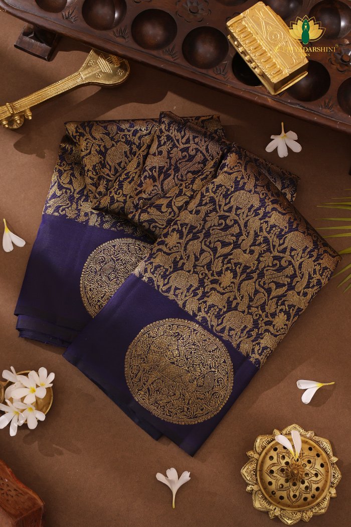 Rich dark blue Kanchipuram silk saree featuring traditional Vanasingaram zari work, reflecting regal heritage and timeless craftsmanship.