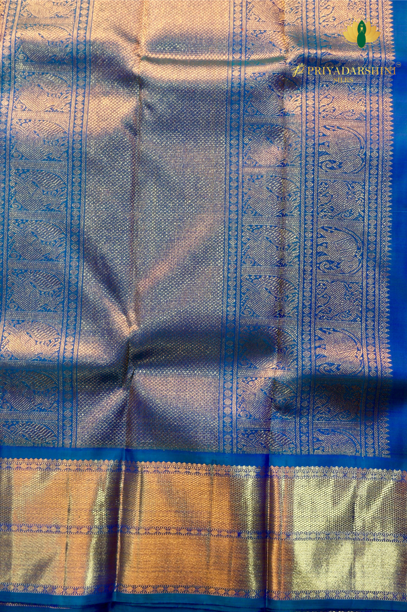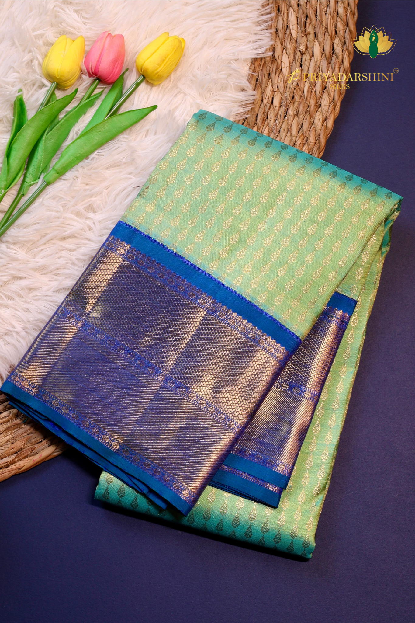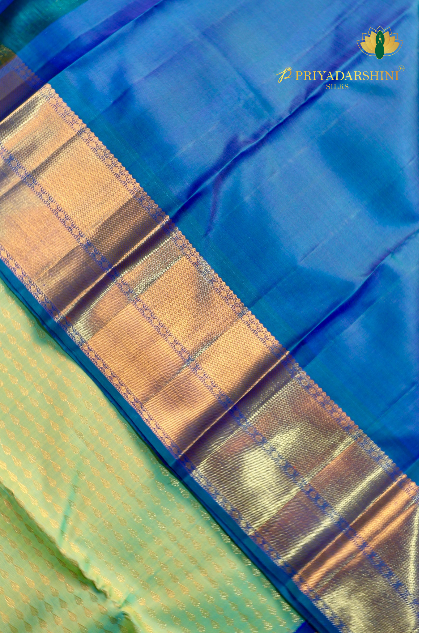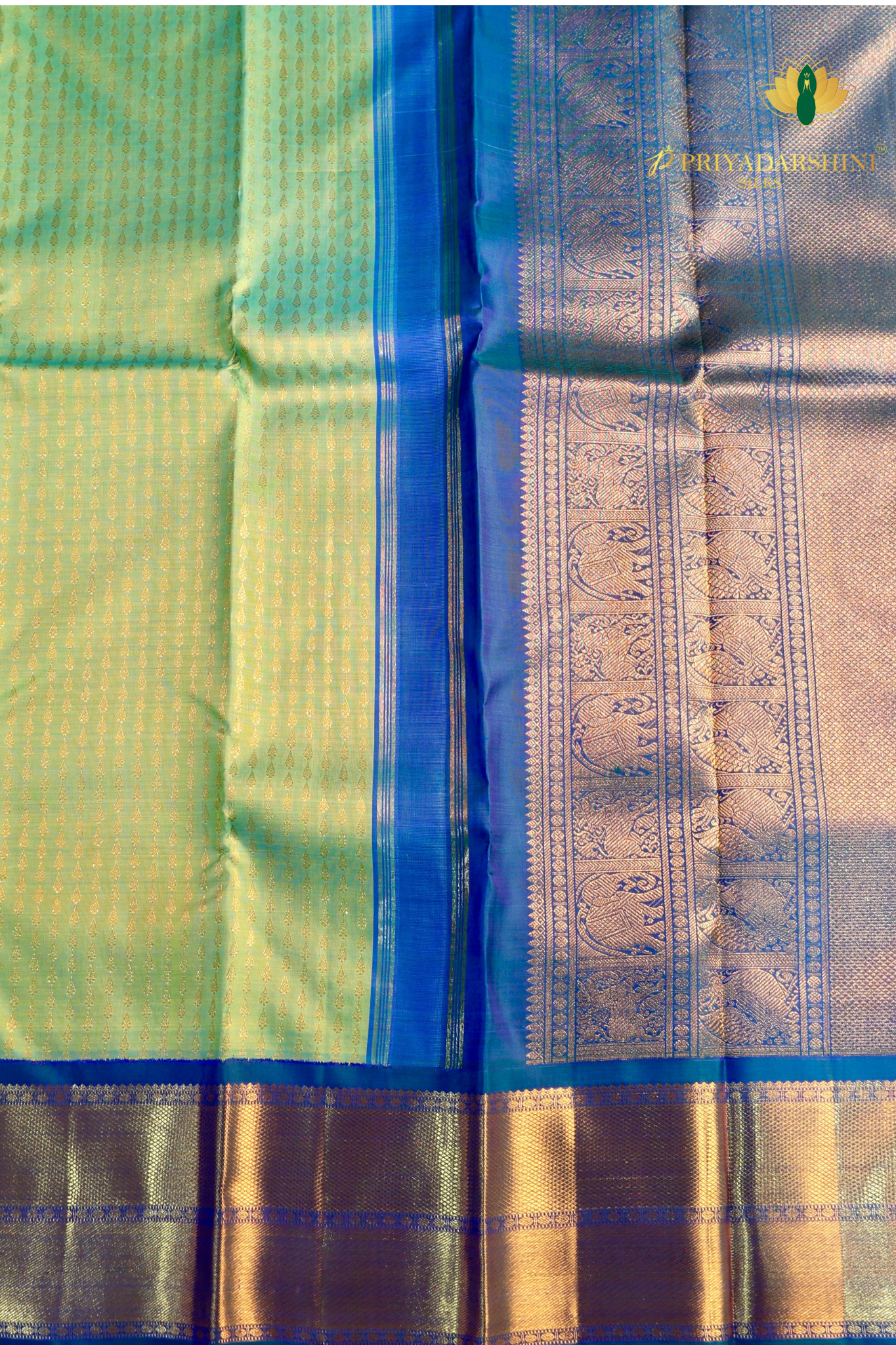 Elegant pista green Kanchipuram silk saree beautifully contrasted with a rich peacock blue Korvai border for a striking traditional look.