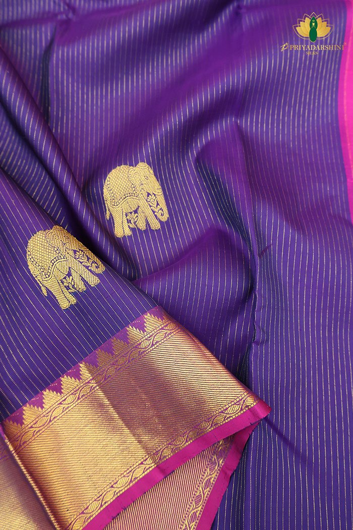 Royal purple Kanchipuram silk saree adorned with traditional elephant butta motifs and a contrasting pink border for a classic festive look.