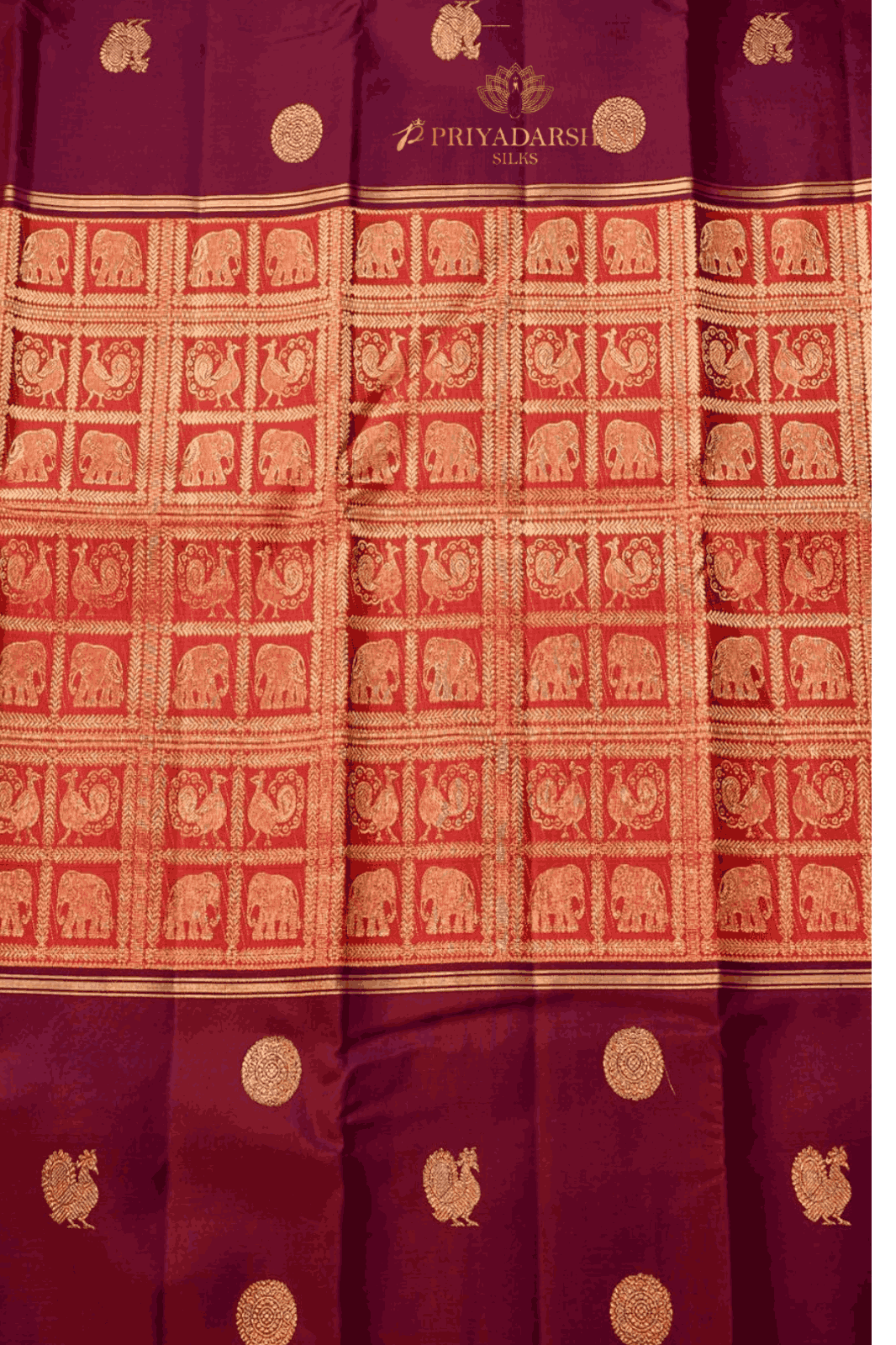 Elegant rust orange Kanchipuram silk saree featuring a classic Muppagam border, woven with rich silk and traditional zari for a timeless festive look.