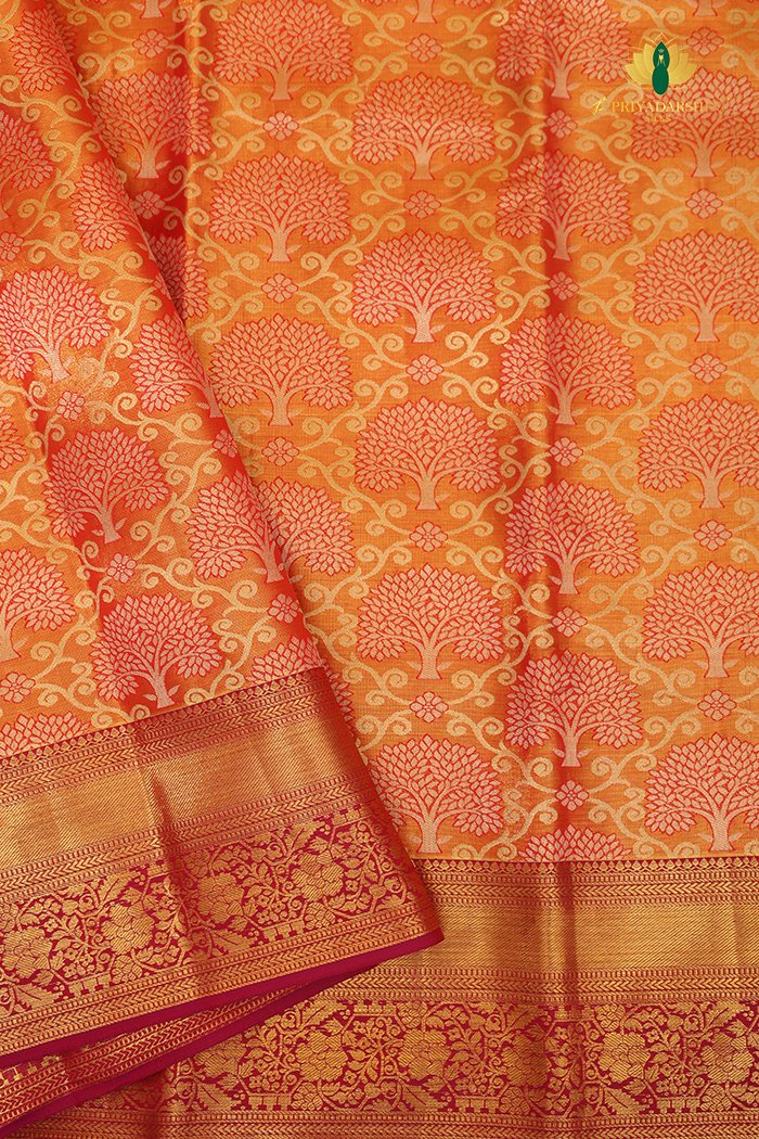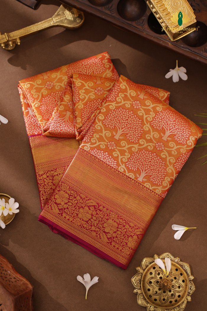 Premium Kanchipuram pure silk saree in vibrant orange with an elegant pink border, featuring traditional South Indian weaving. Perfect for weddings, festive occasions, and special celebrations.