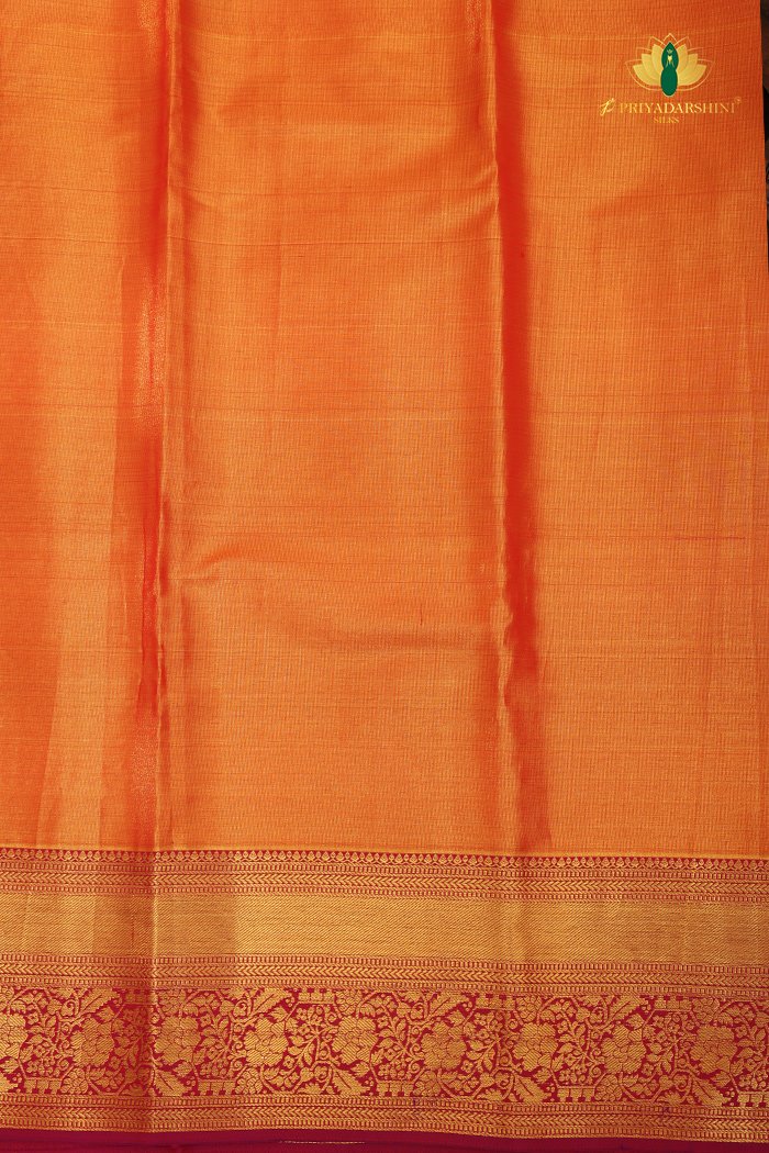 This exquisite Kanchipuram pure silk saree in auspicious orange is beautifully complemented by a rich pink border, reflecting the timeless heritage of South Indian craftsmanship. Handwoven using pure mulberry silk and traditional techniques, this saree embodies elegance, grace, and cultural richness. Ideal for bridal wear, weddings, muhurtham ceremonies, and grand festive occasions, it offers a regal drape and luxurious feel. The vibrant color combination symbolizes prosperity and celebration, making it a perfect choice for special moments. A classic heirloom piece that showcases the beauty of authentic Kanchipuram silk.