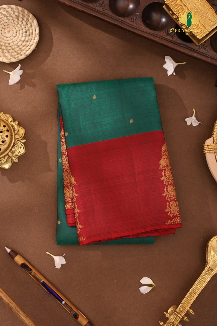 Elegant Kanchipuram silk saree in rich teal green, highlighted with a shimmering zari work border for a regal finish.
