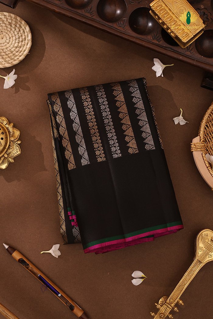 Make a statement in this Black Kanchipuram Silk Saree with elegant silver and gold zari work, rich traditional weaving, and luxurious silk – perfect for weddings, festivals, and special occasions.