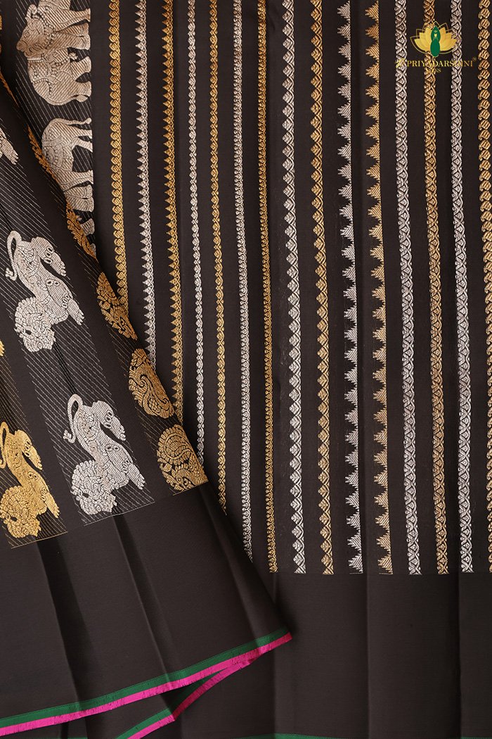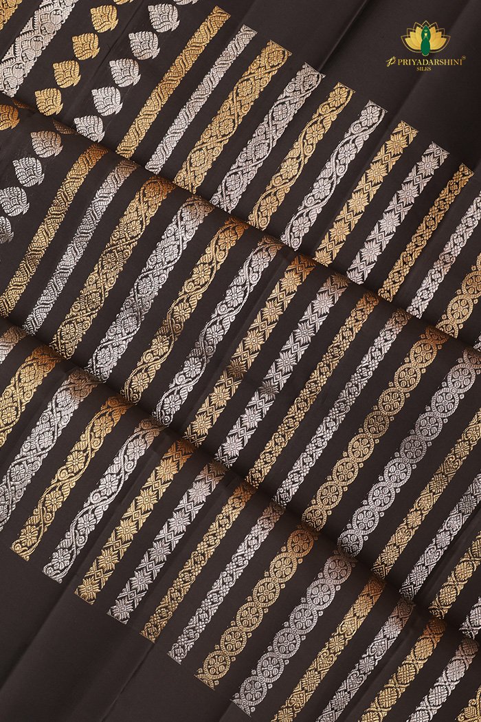 Exude elegance and sophistication with this Black Kanchipuram Silk Saree adorned with exquisite silver and gold zari work. Crafted from premium silk, it showcases intricate traditional weaving that adds a luxurious texture and regal appeal. The bold black base beautifully contrasts with the shimmering zari motifs, making it an ideal choice for bridal wear, festive celebrations, and cultural events. Designed for graceful draping and comfort, this saree can be paired with statement jewelry to enhance its majestic charm. A timeless addition to any ethnic wardrobe, it seamlessly blends traditional craftsmanship with a modern, stylish touch, perfect for making a memorable impression.