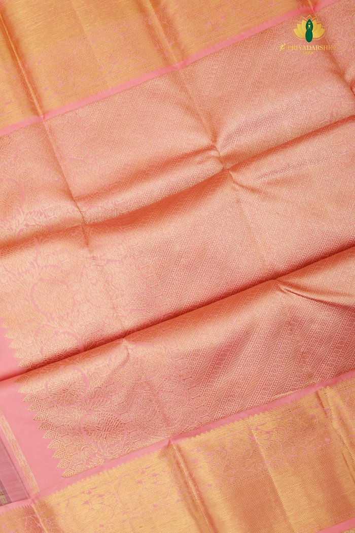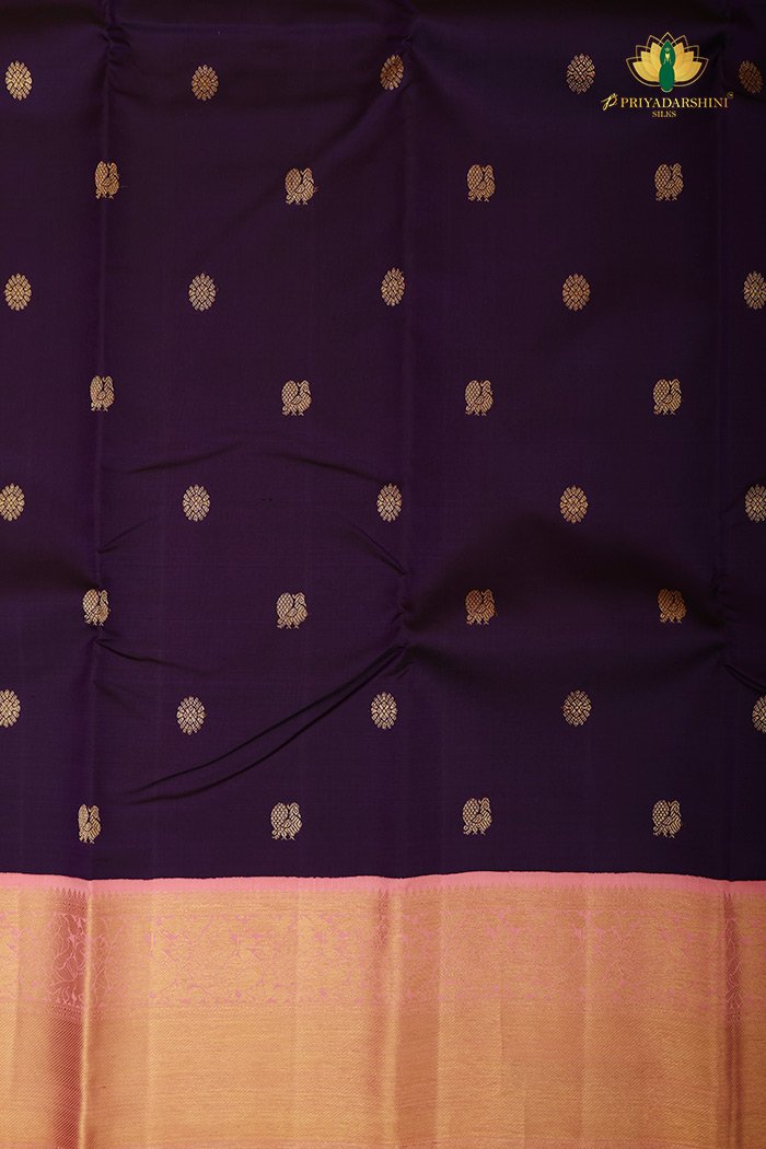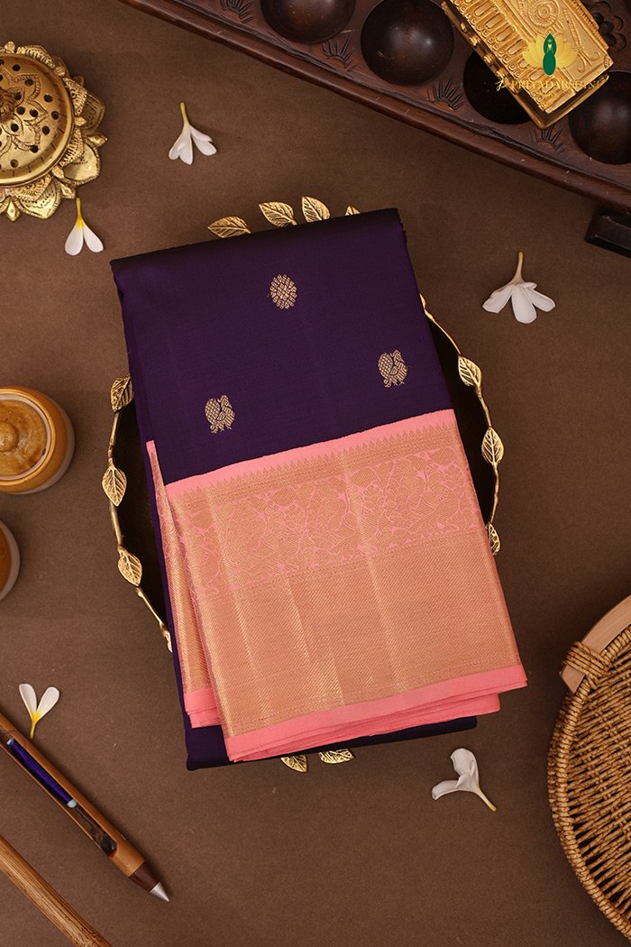 Graceful and elegant, this Purple Kanchipuram Silk Saree with a Light Pink Border features traditional weaving, luxurious silk, and intricate design – perfect for weddings, festivals, and festive occasions.