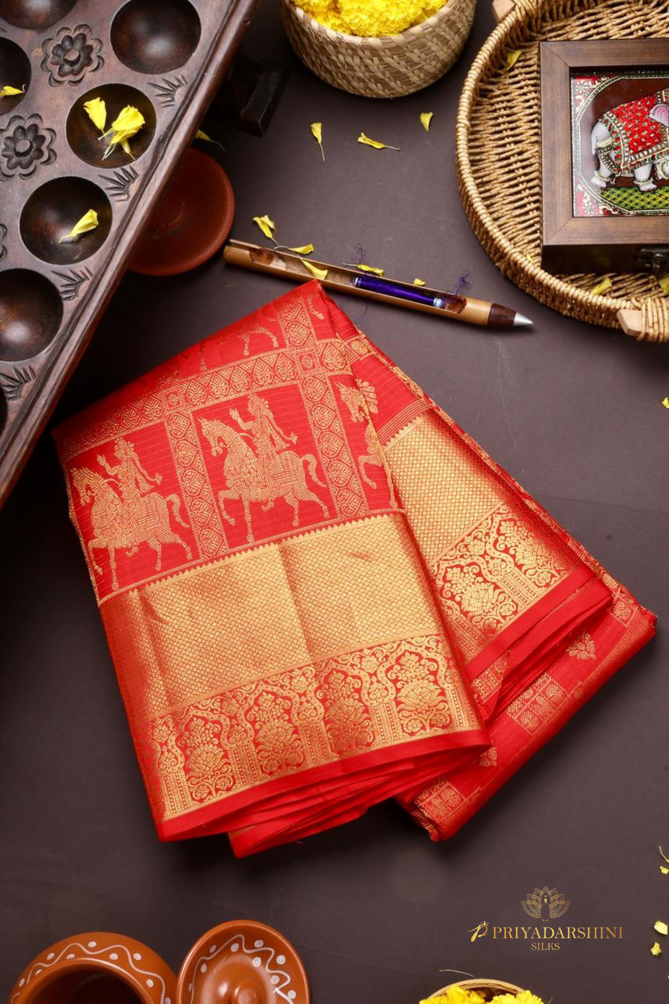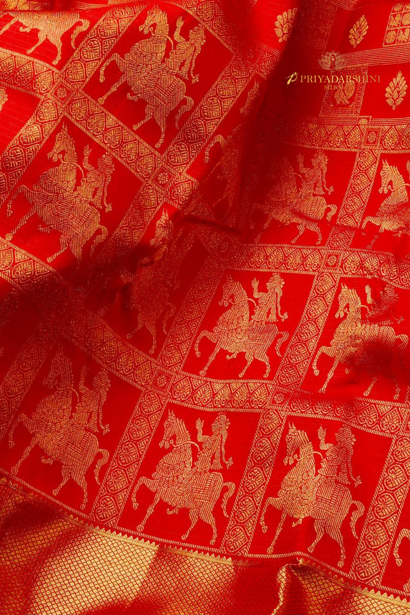 Step into regal splendor with this Chili Red silk saree from Priyadharshini Silks. The saree features a majestic king motif riding a spirited horse across a richly ornate pallu, meticulously woven to highlight royal elegance. The vibrant chili red color palette enhances the grandeur, making it an exquisite choice for weddings, festive celebrations, and special occasions. Combining traditional artistry with eye-catching design, this saree is perfect for those who wish to make a bold, royal statement. Crafted for sophistication, it embodies the heritage of South Indian silk weaving in every thread.