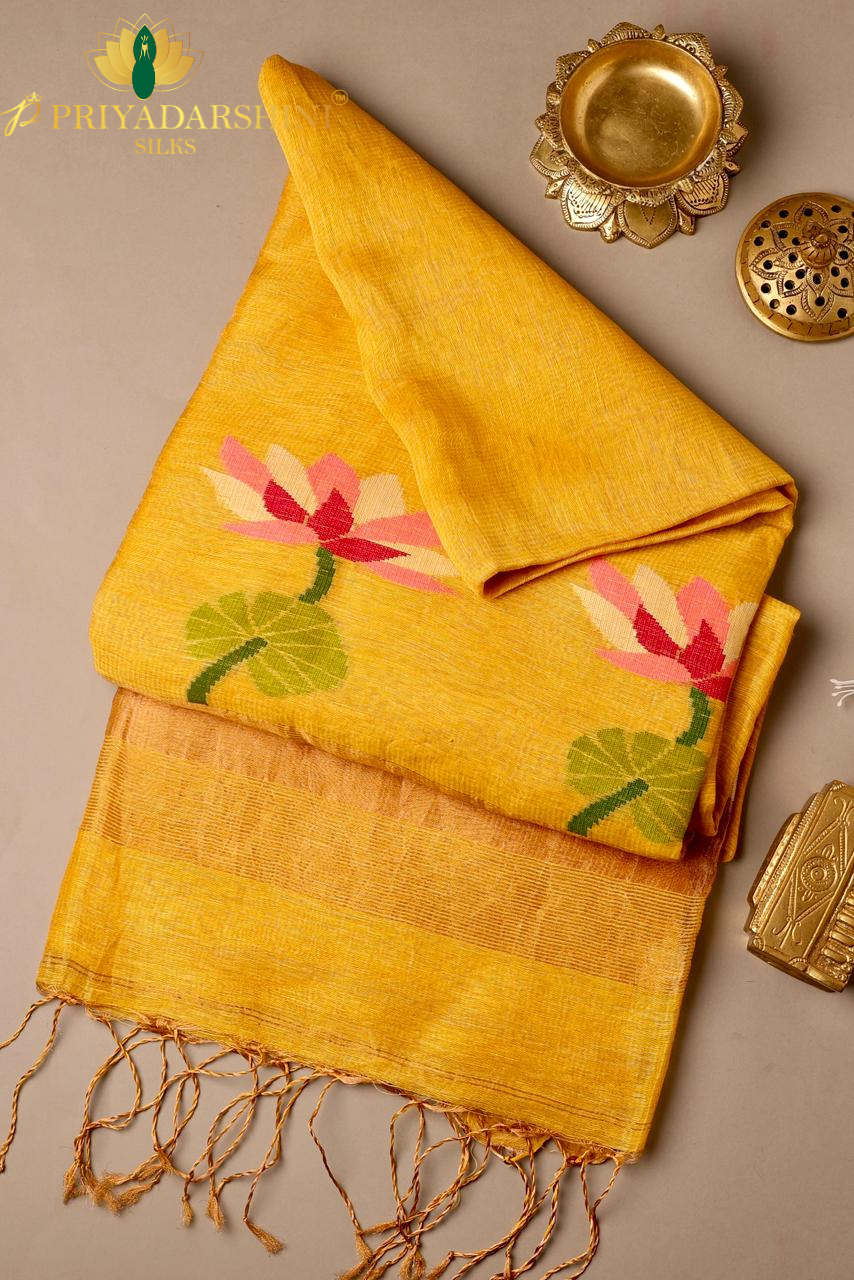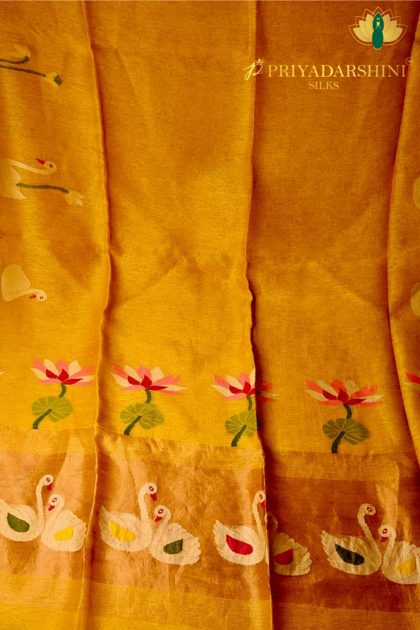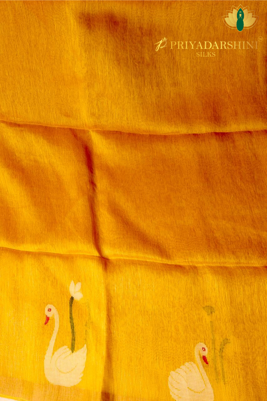 Bright yellow linen saree featuring graceful swan motifs, offering a refreshing blend of comfort and timeless elegance.