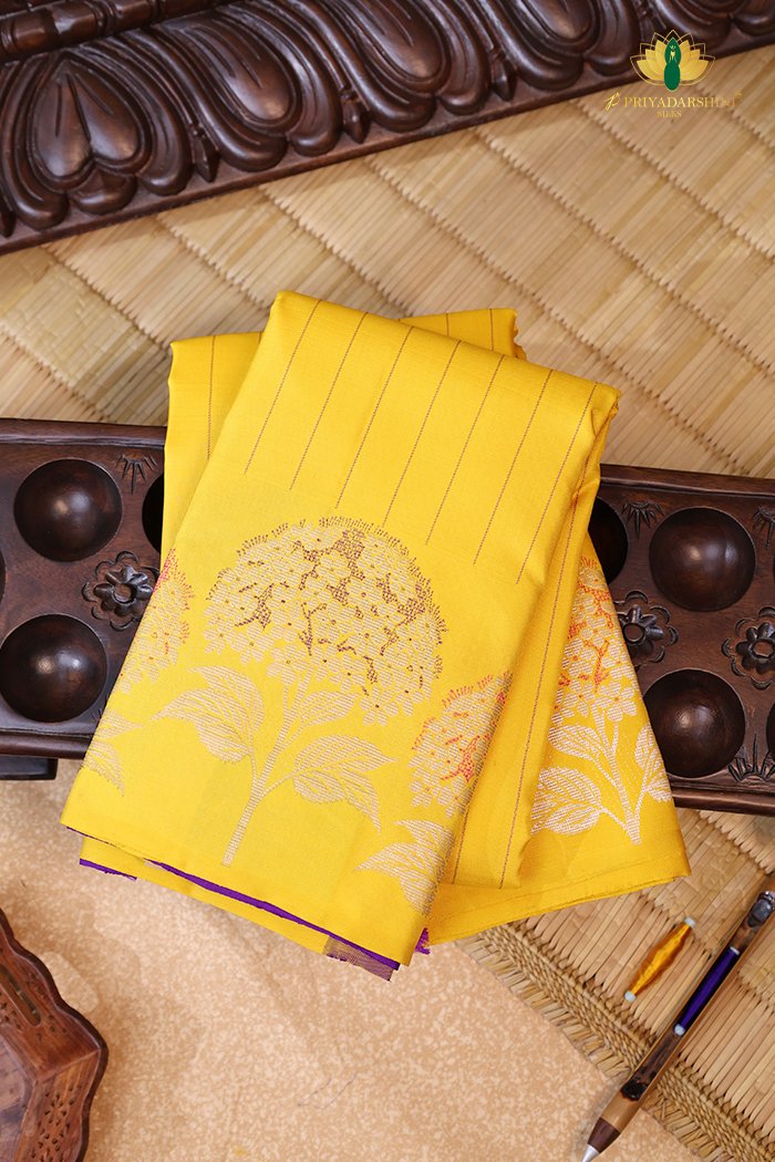 This exquisite Kanchipuram pure silk saree is beautifully adorned with majestic floral motifs woven in vibrant mango and royal purple tones. Handcrafted with traditional artistry, the rich color combination adds depth and regal charm to the saree. Perfect for weddings, muhurtham, and festive occasions, this piece reflects timeless elegance and classic Kanchipuram craftsmanship.