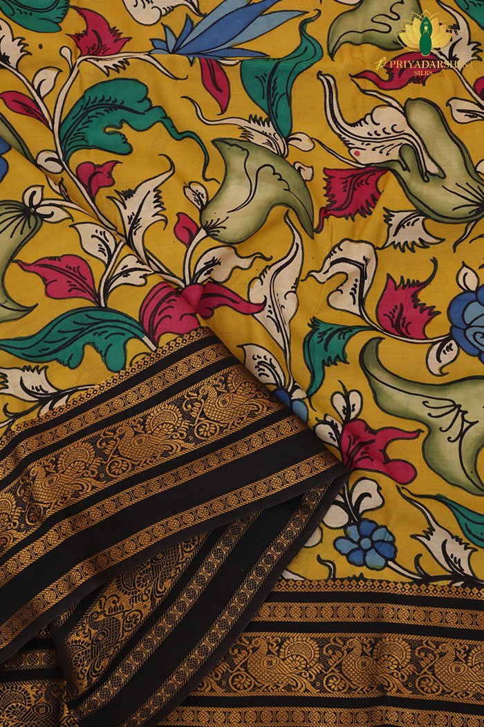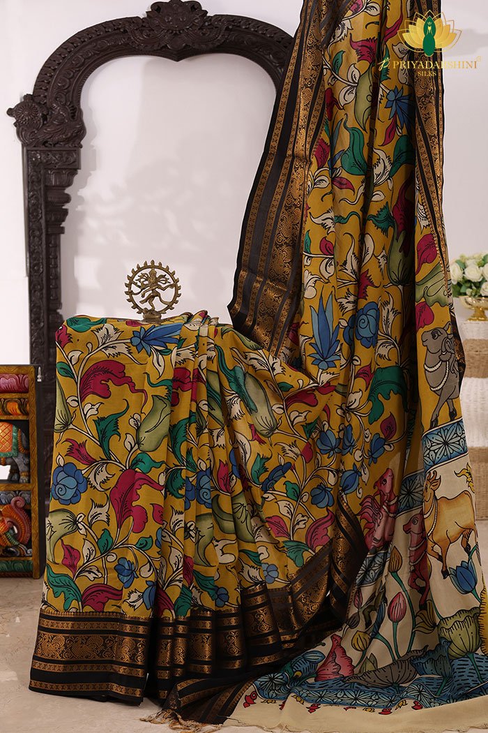 Pure handloom silk saree in a striking mustard yellow and black combination, elegantly enhanced with hand-painted Kalamkari artistry.