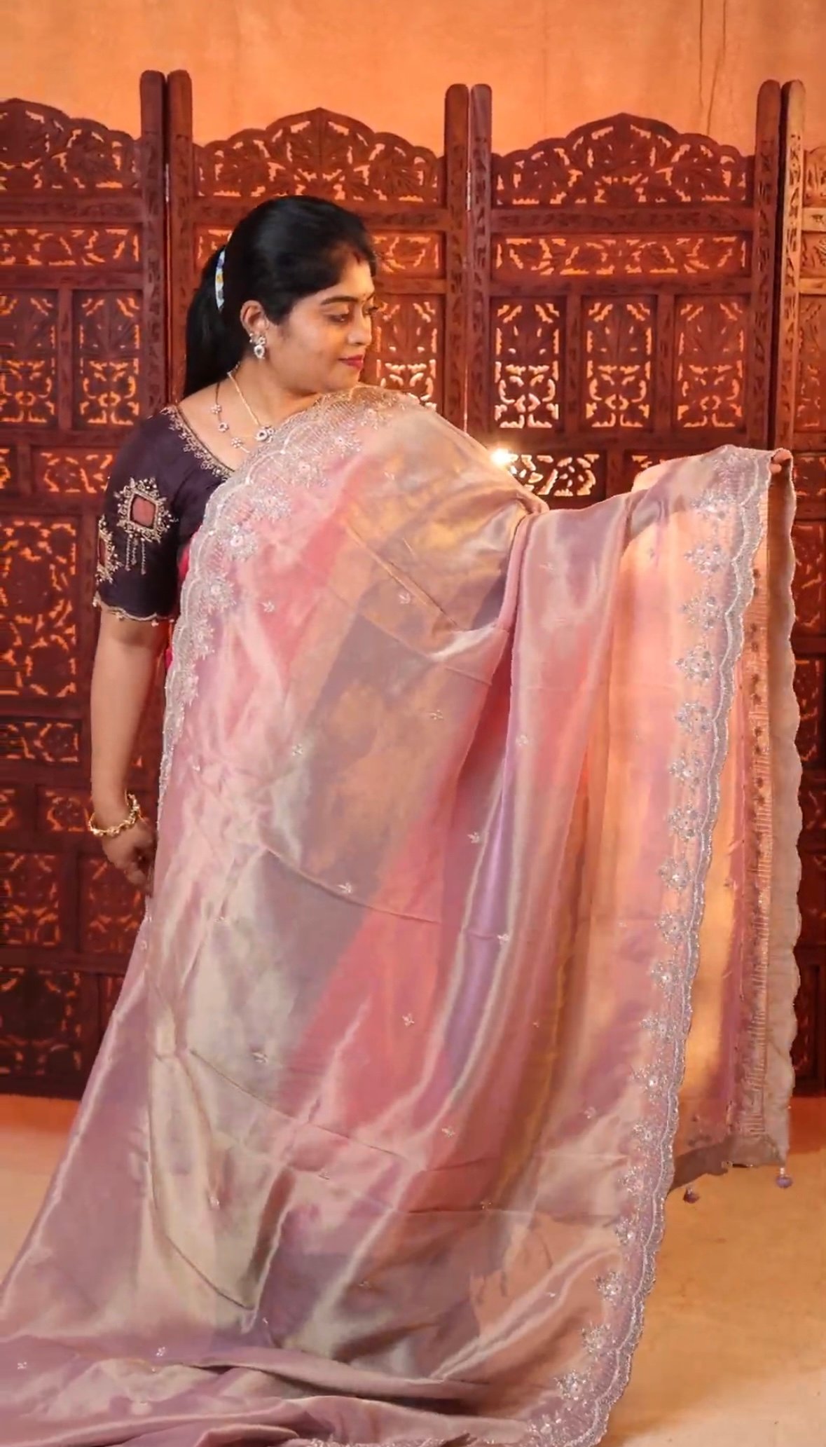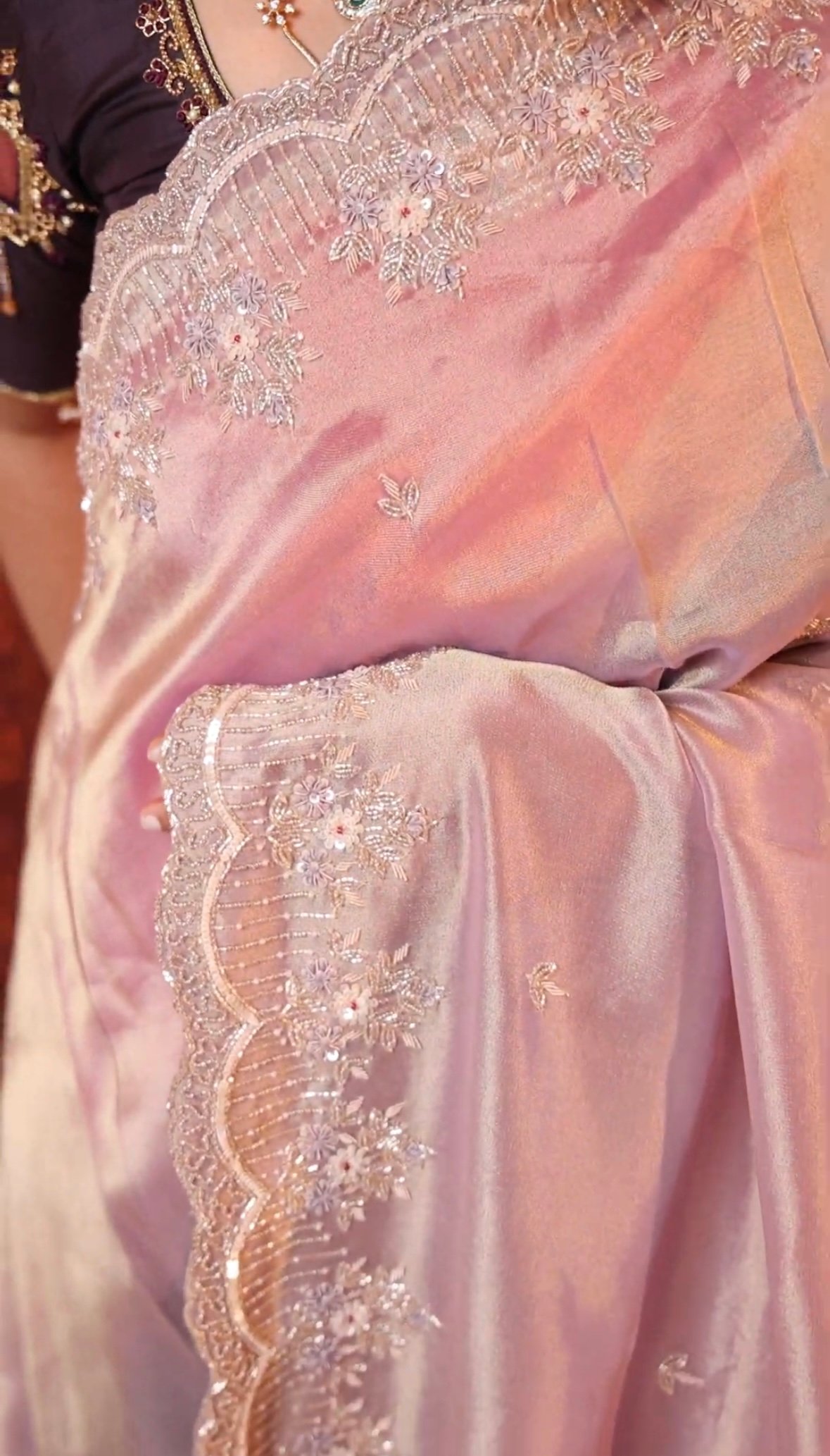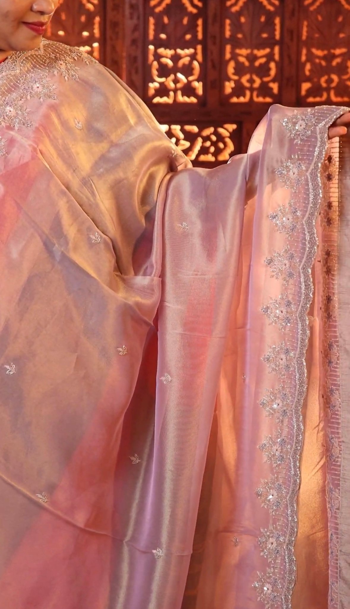 Luxurious party wear tissue silk saree adorned with intricate Zardozi and Aari embroidery. Lightweight, shimmering, and perfect for weddings, receptions, festive occasions, and grand celebrations.