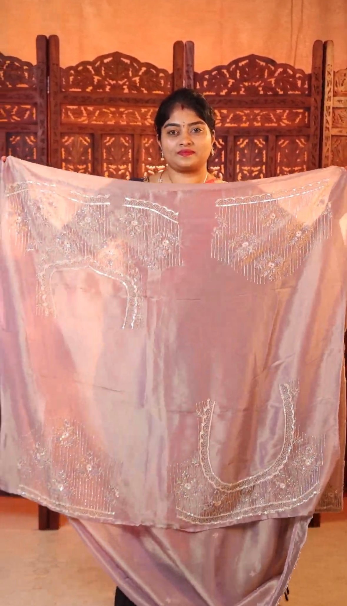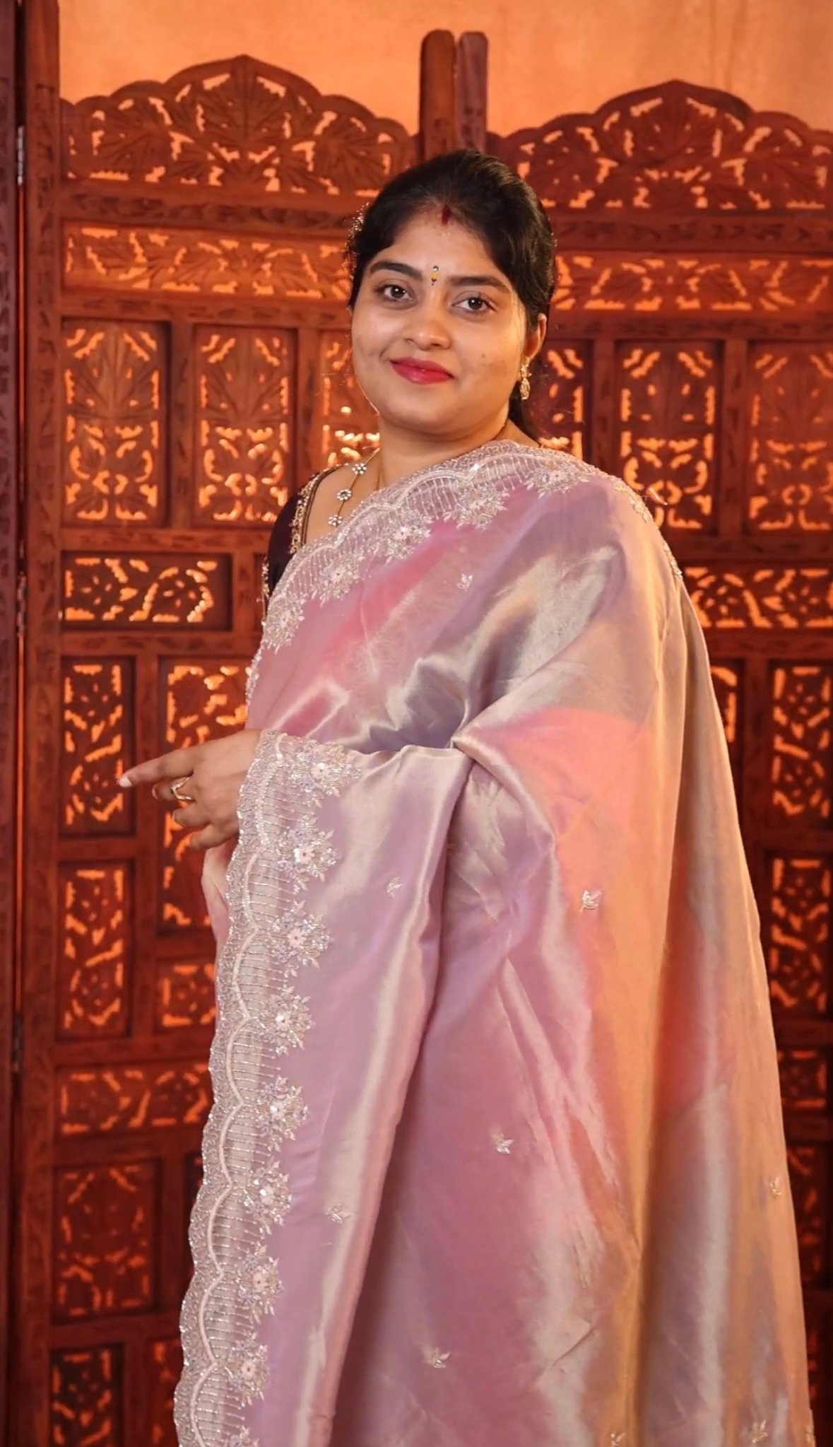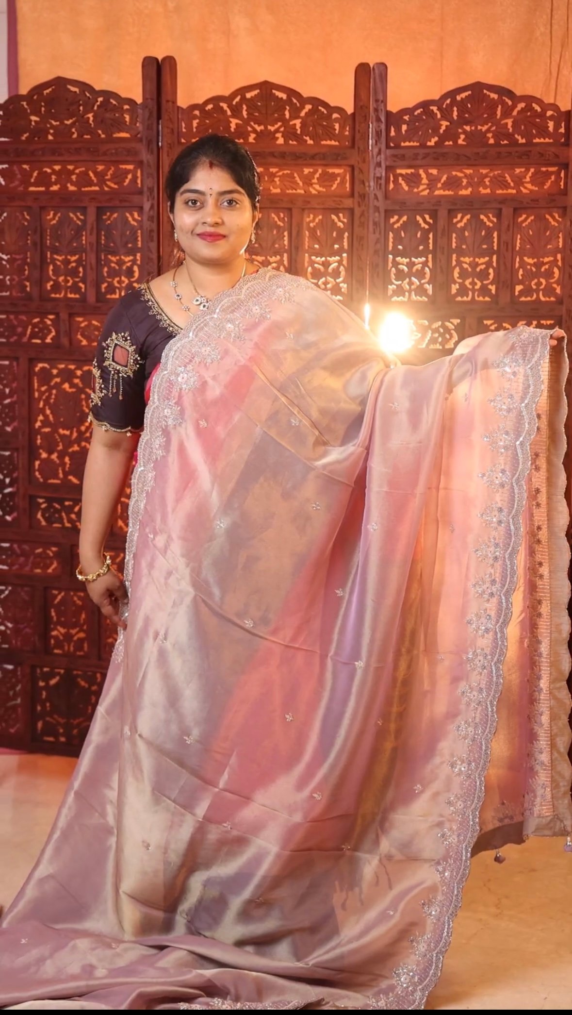 Luxurious party wear tissue silk saree adorned with intricate Zardozi and Aari embroidery. Lightweight, shimmering, and perfect for weddings, receptions, festive occasions, and grand celebrations.