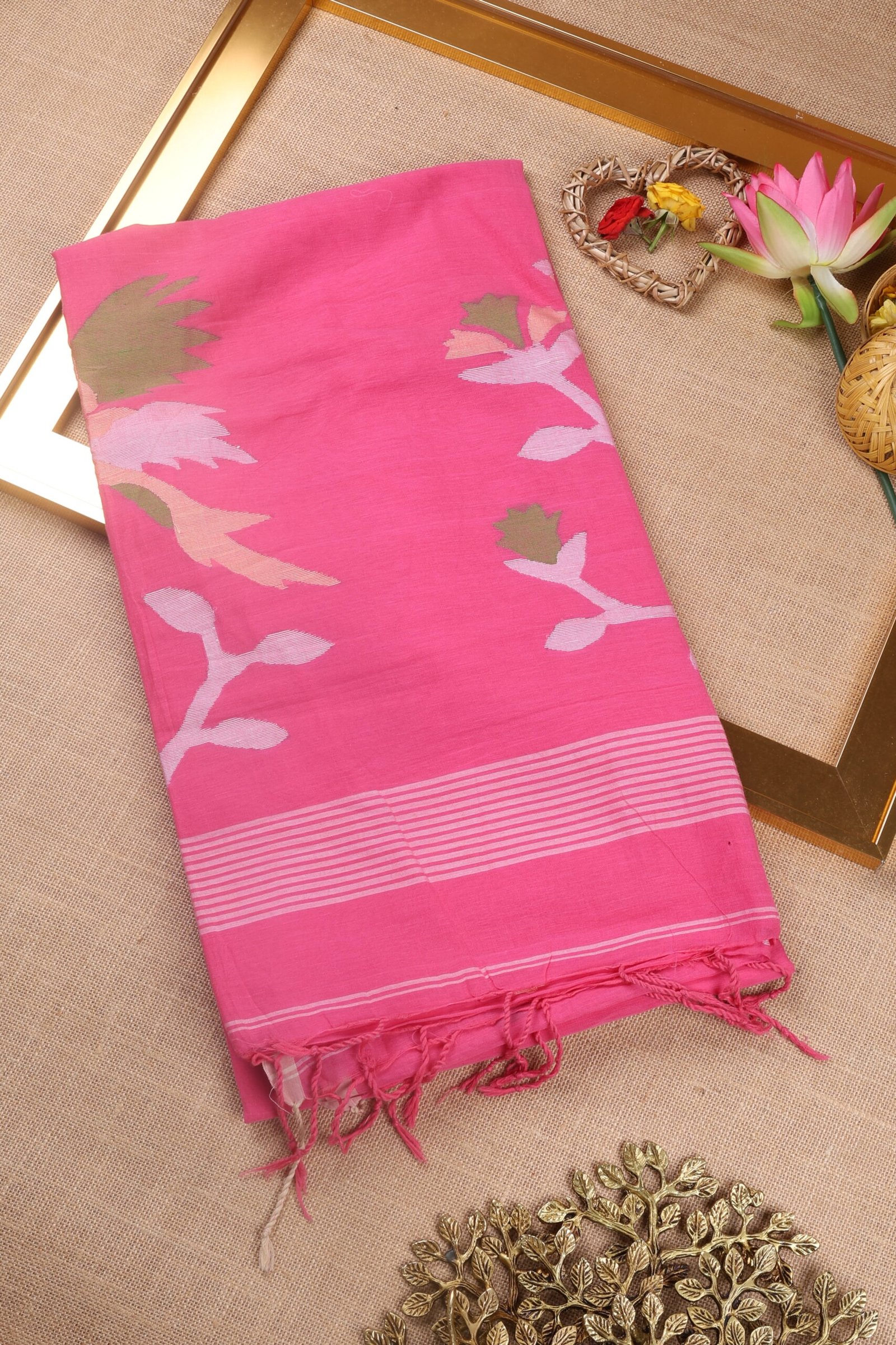 The soothing pink hue exudes femininity and grace, making it suitable for a variety of occasions—from casual outings to small gatherings and daytime events. What truly elevates this saree is the presence of elegant silver-white floral motifs spread delicately across the fabric. These subtle designs lend a refined charm, enhancing the saree’s overall appeal without overwhelming its simplicity.