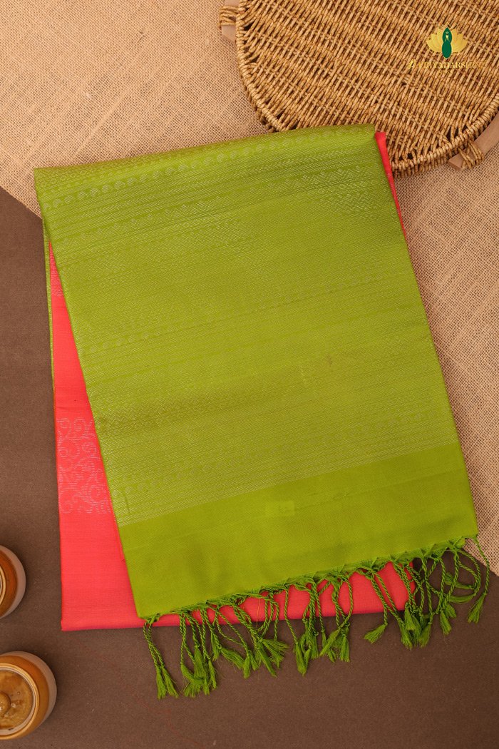 Vibrant Priyadarshini Soft Silk saree in bright orange with refreshing green accents for a graceful everyday elegance.