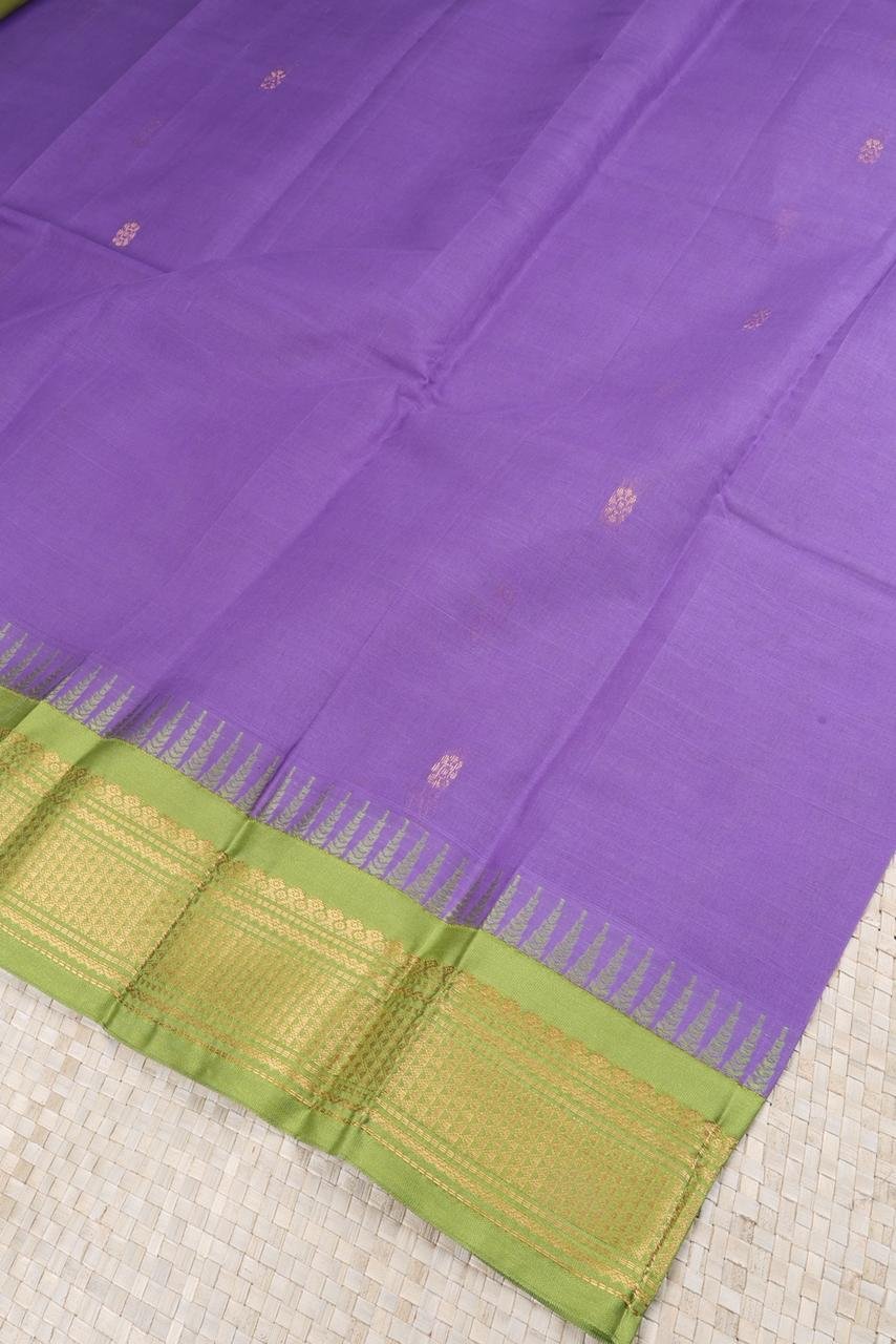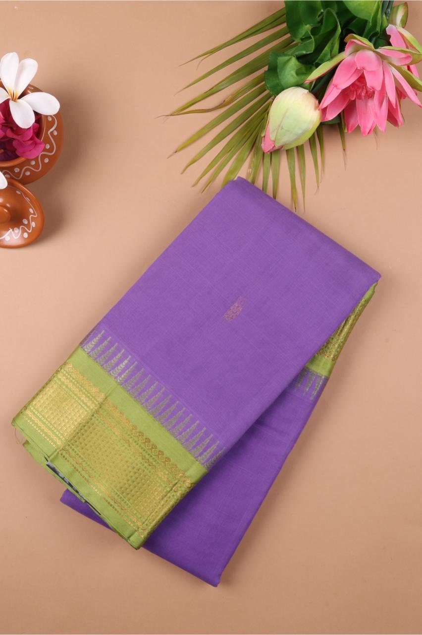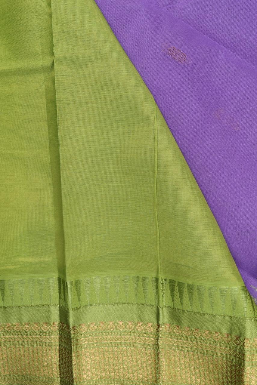 Elegant purple Gadwal handloom saree featuring a vibrant parrot green cotton-silk korvai border, blending traditional weaving with a striking color contrast.