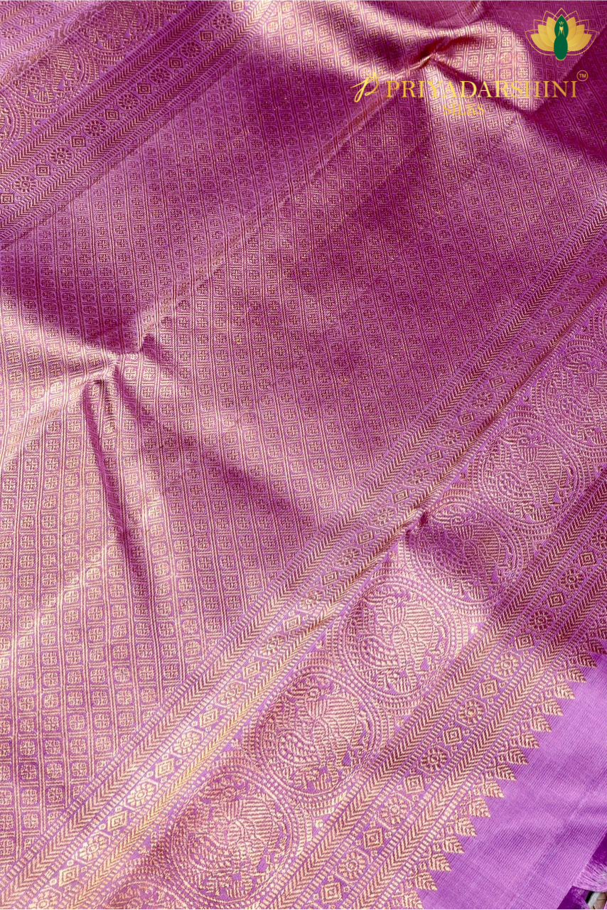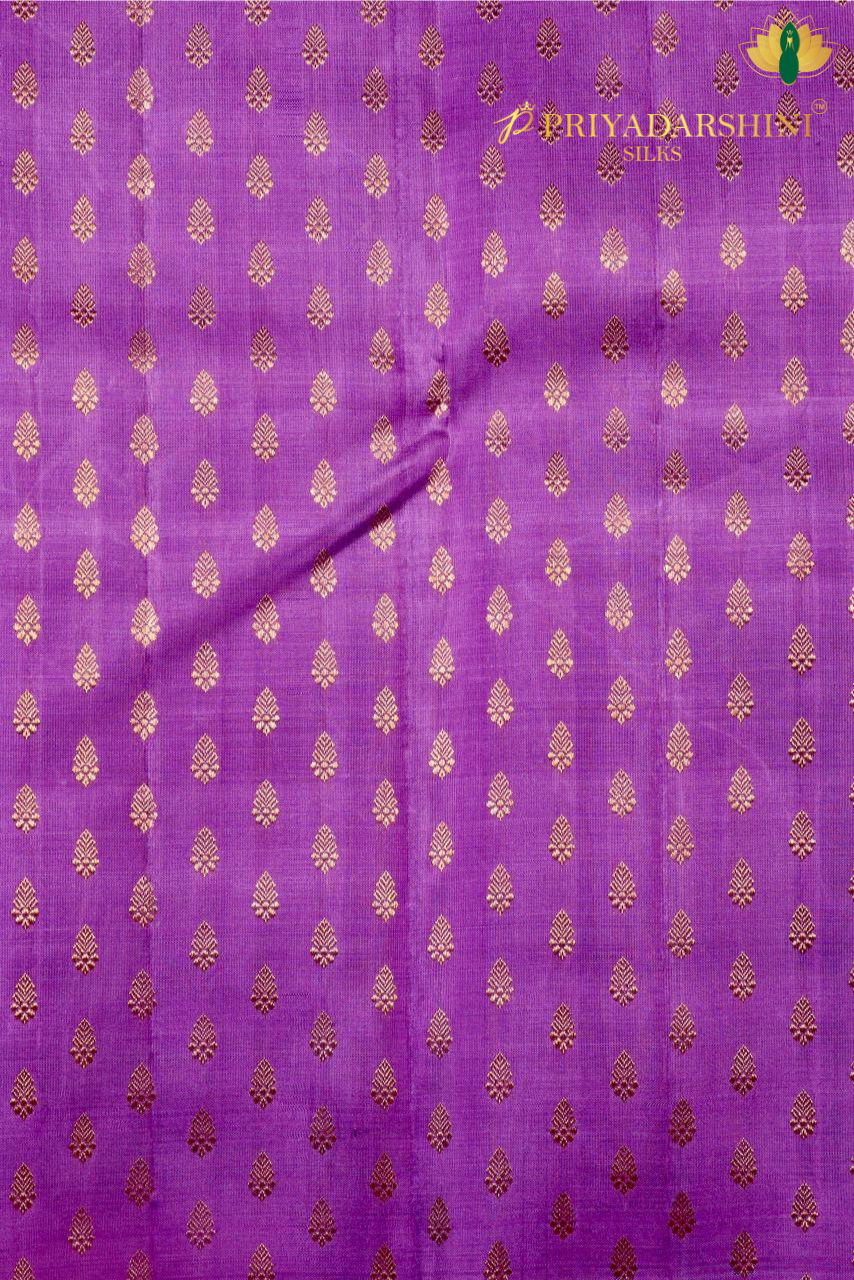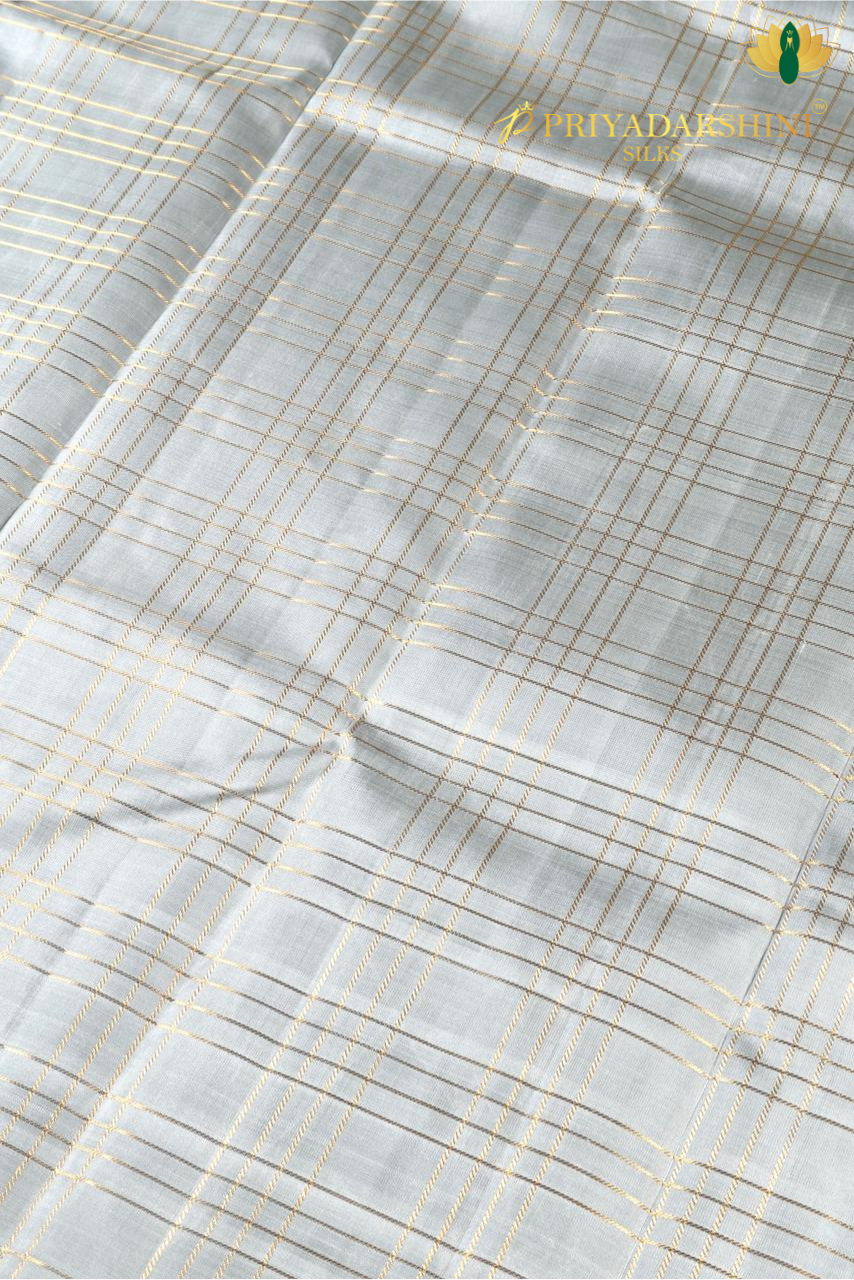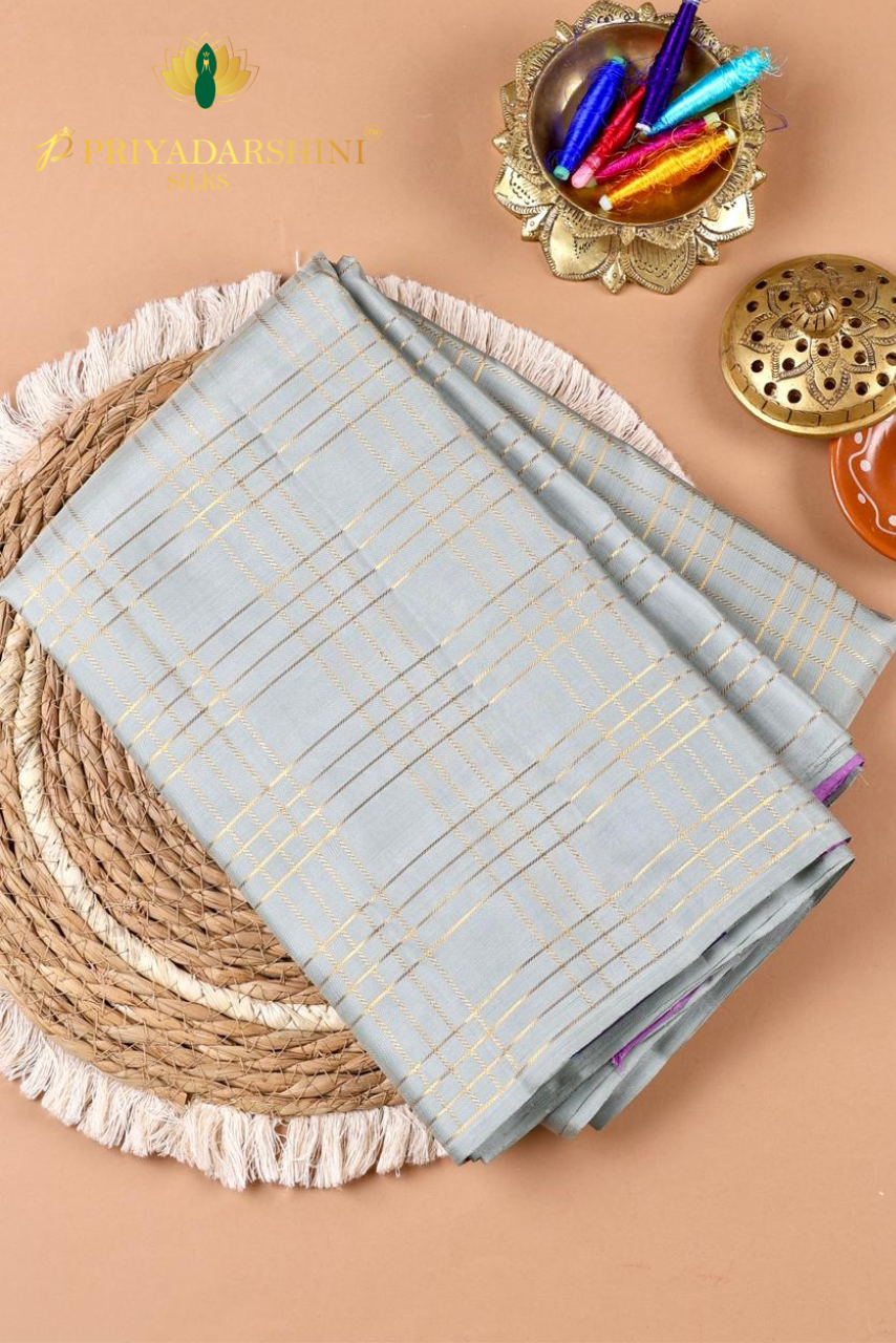 Elevate your traditional wardrobe with this Pure Kanchivaram Silk Saree from Priyadharshini Silks, crafted in a sophisticated ash color and enhanced with a rich traditional purple pallu. The subtle ash body exudes understated elegance, while the vibrant purple pallu adds a regal contrast that highlights the beauty of Kanchivaram weaving.