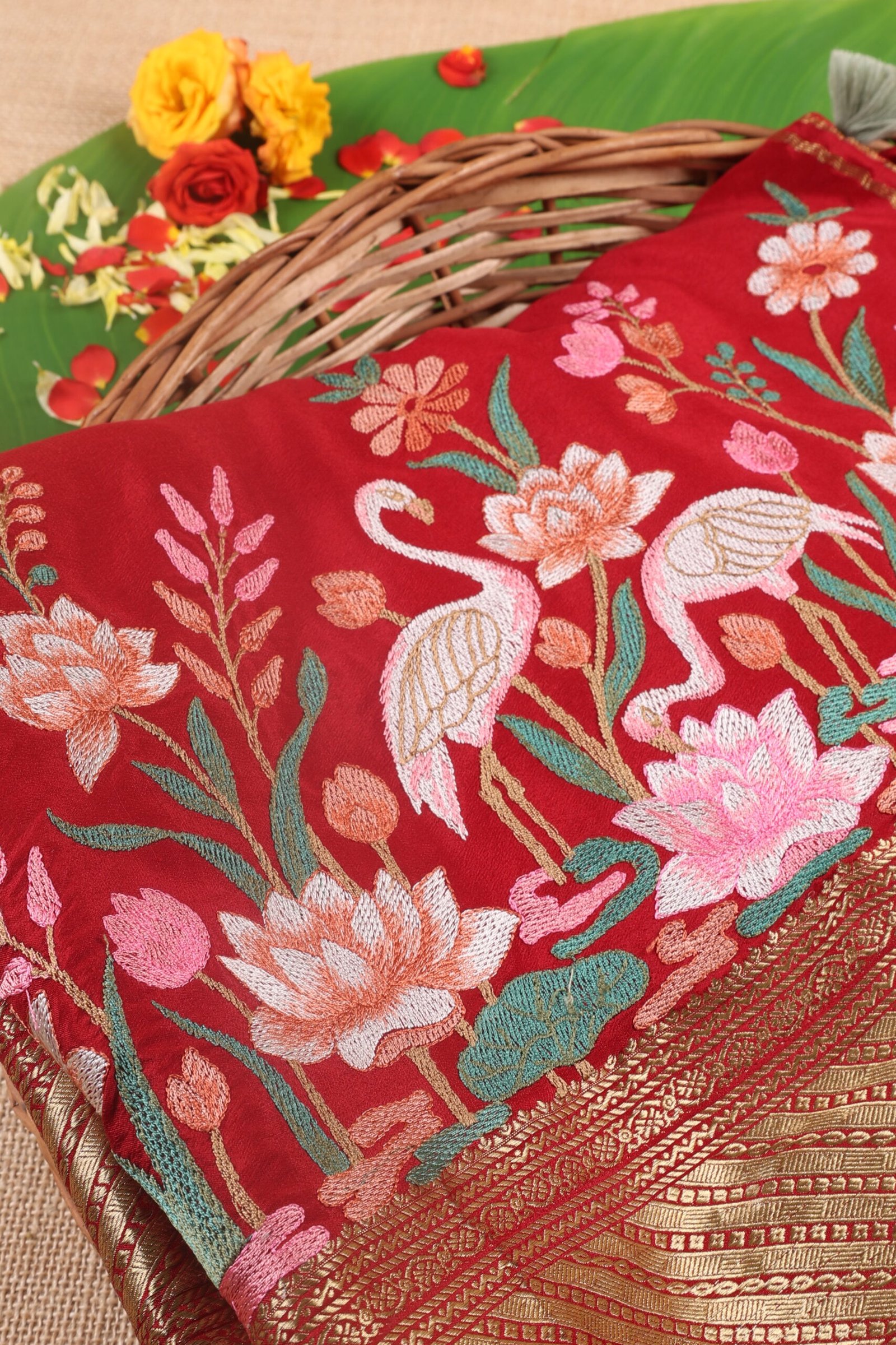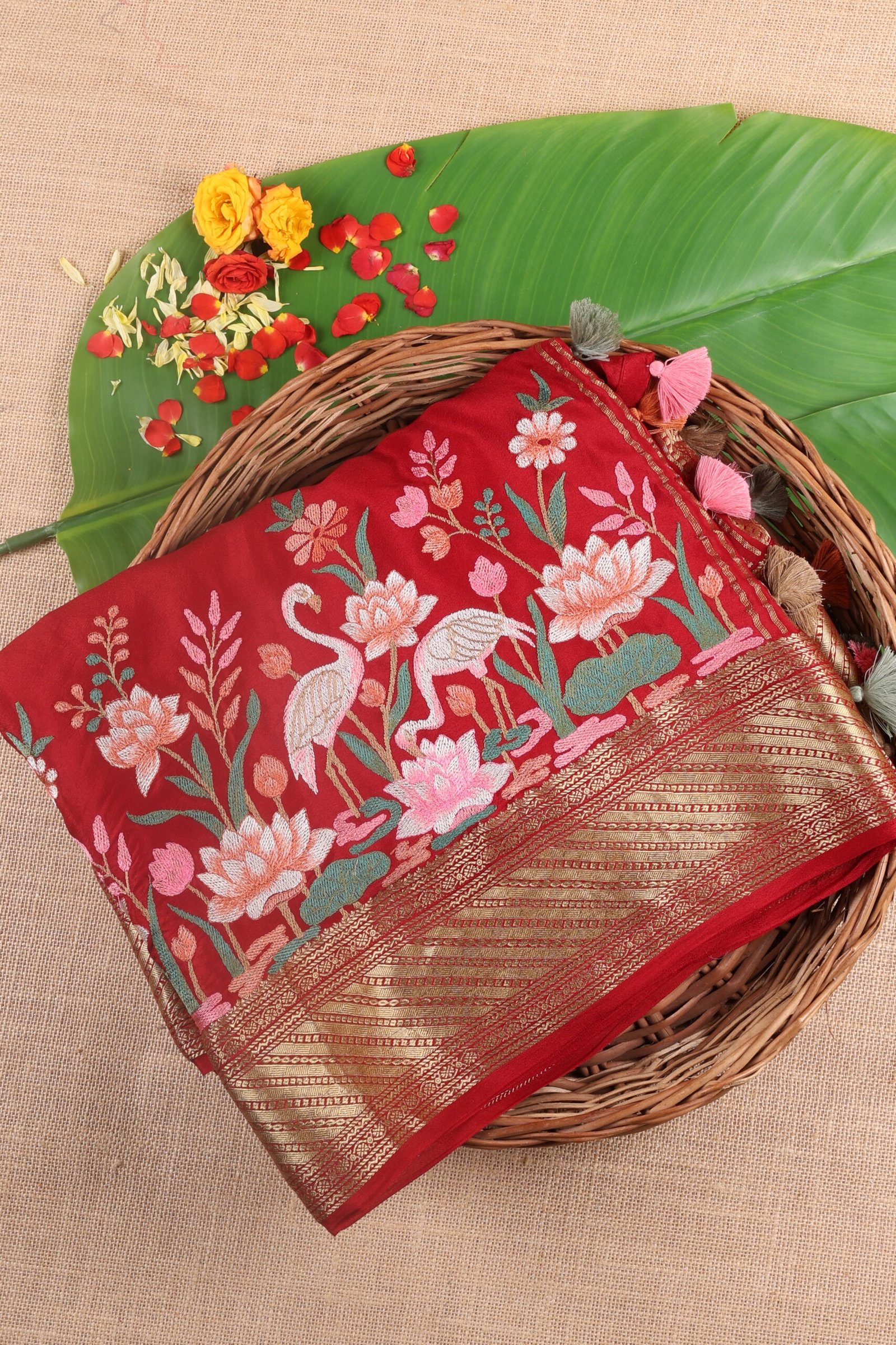 A striking red crepe saree adorned with hand-embroidered flamingos, pastel lotus blooms, and delicate greenery for a bold yet graceful look.