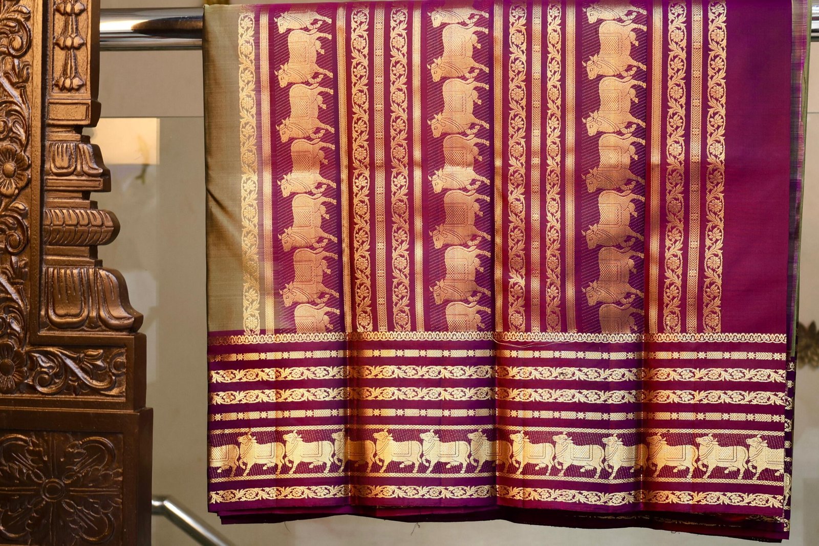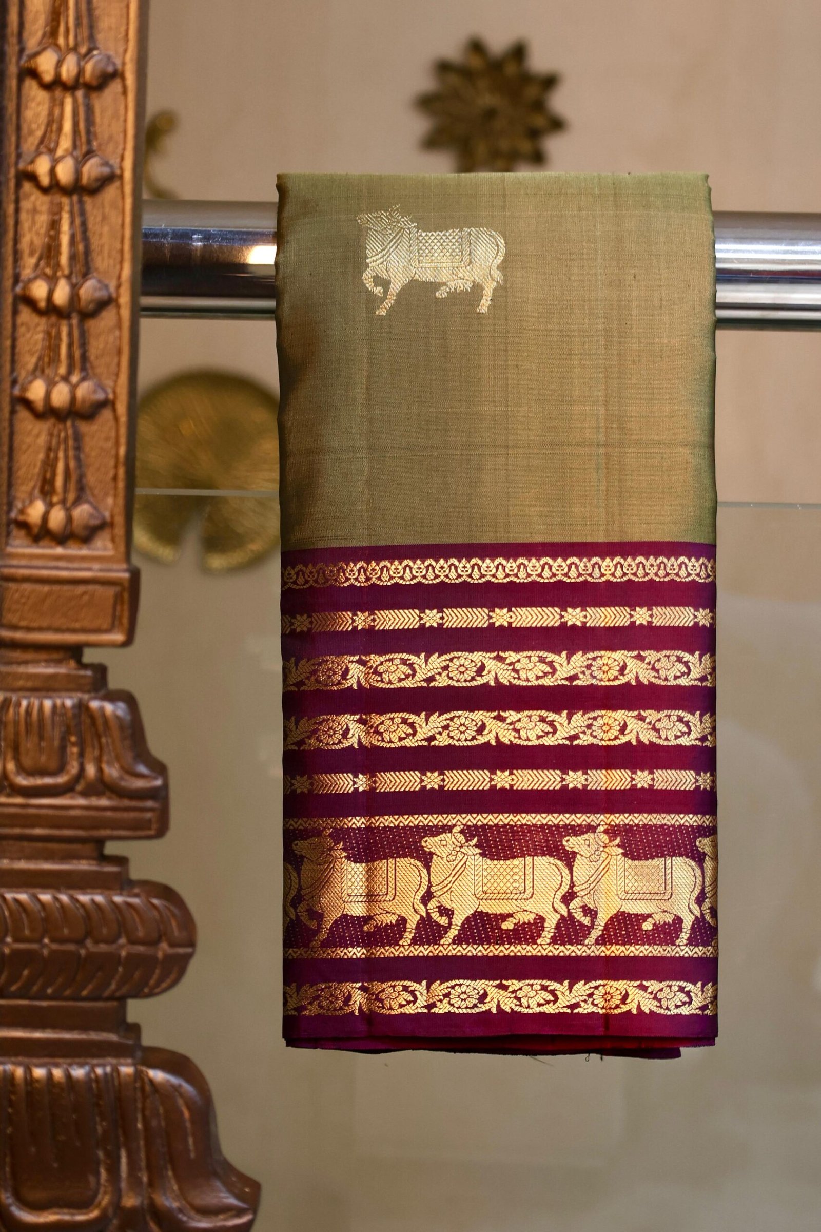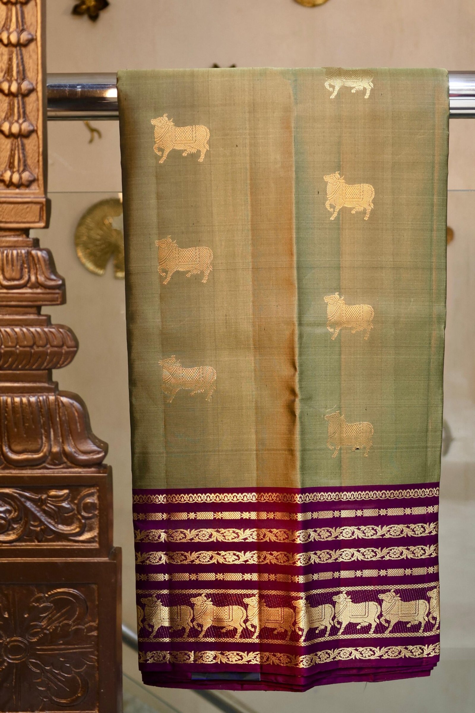 Classic brown soft silk saree featuring traditional cow design motifs, reflecting heritage charm and graceful elegance.