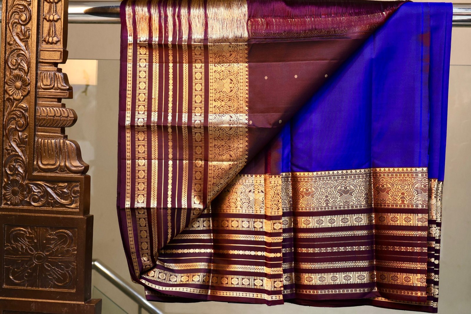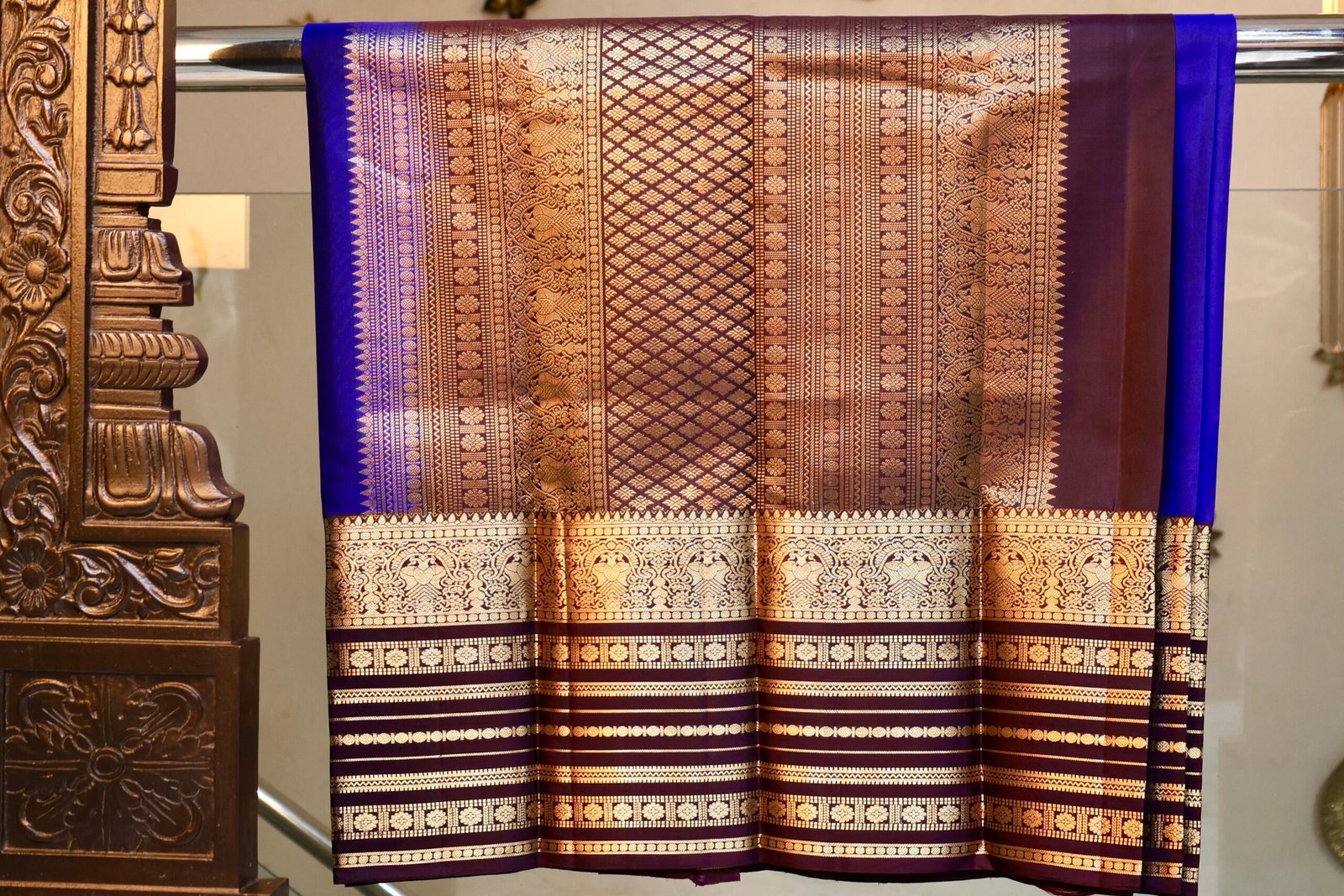 Rich purple Kanchipuram silk saree adorned with traditional elephant butta motifs and a contrasting pink border, showcasing timeless South Indian elegance.