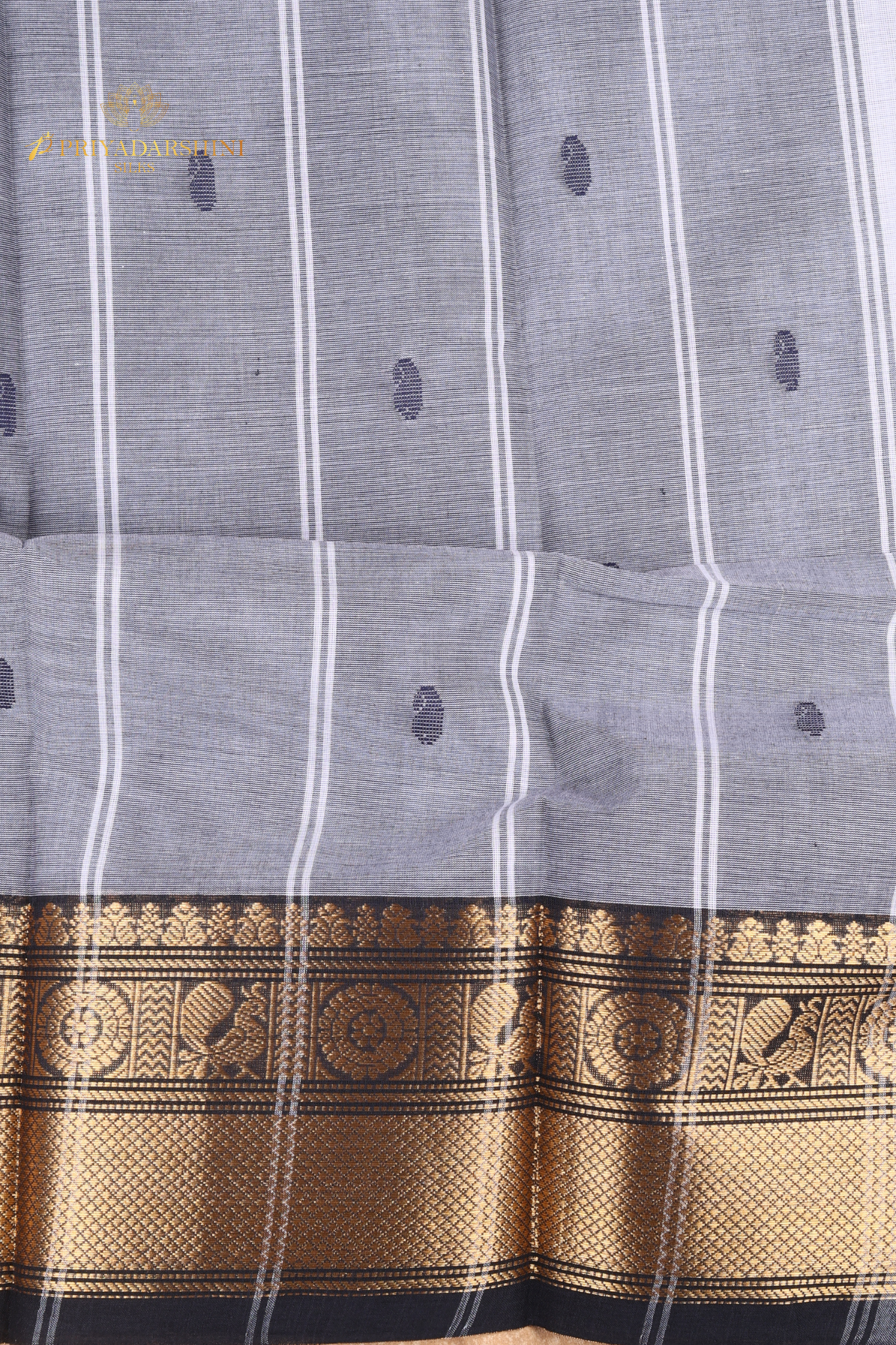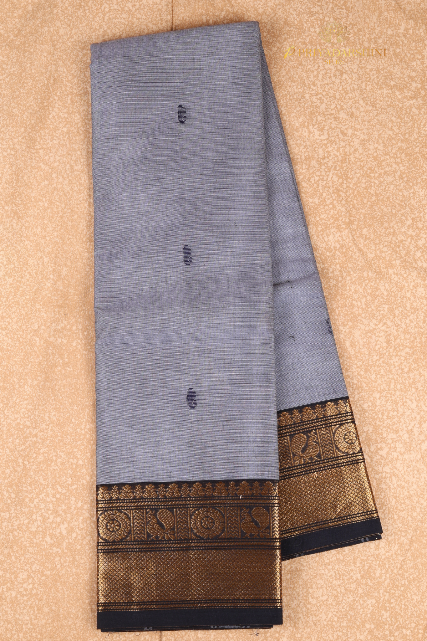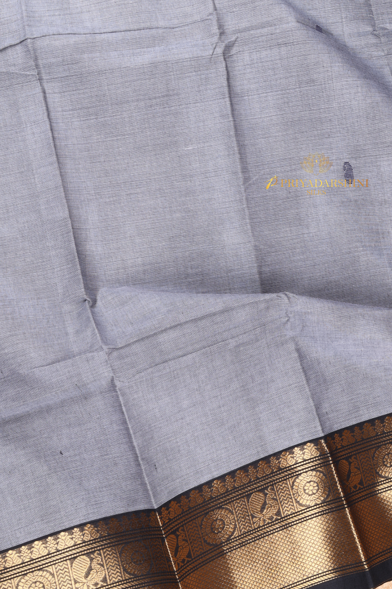 Elevate your traditional style with this Steel Gray Chettinad Cotton Saree, featuring a rich midnight blue border with elegant gold zari Annapakshi motifs.