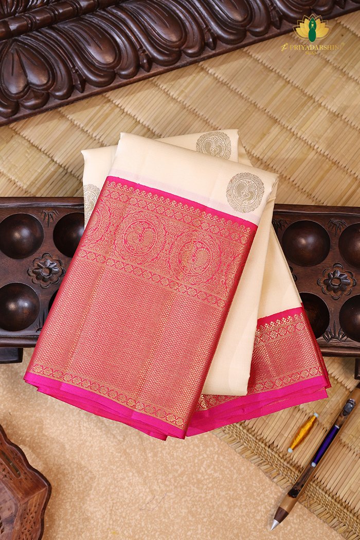 Traditional Kai Korvai Kanchipuram pure silk saree in a graceful half white shade, beautifully paired with a rich Rani pink contrast.