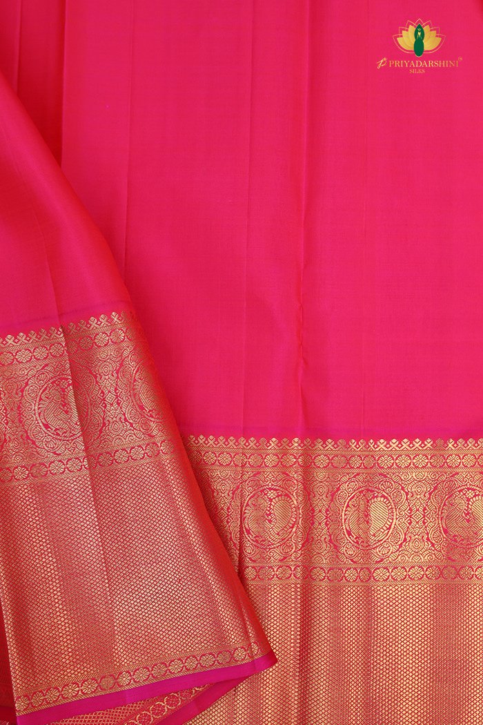 This exquisite traditional Kai Korvai Kanchipuram pure silk saree features a serene half white body complemented by a vibrant Rani pink contrast, highlighting the mastery of classic Korvai weaving. Handwoven with precision, the contrasting colors add strength, richness, and timeless elegance. Perfect for weddings, muhurtham, and auspicious occasions, this saree embodies purity, tradition, and regal charm.