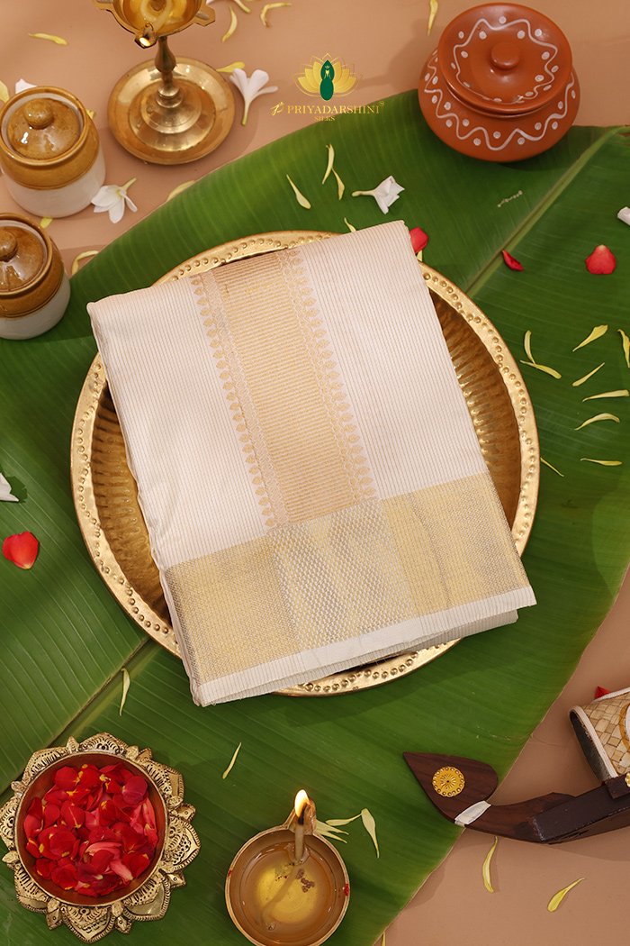 Zari border off white silk dhoti with a sophisticated and traditional appeal.