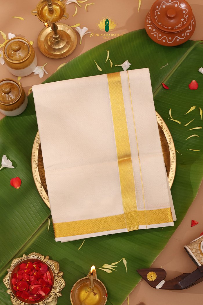 Zari border sandal cotton dhoti with a subtle, elegant traditional appeal.